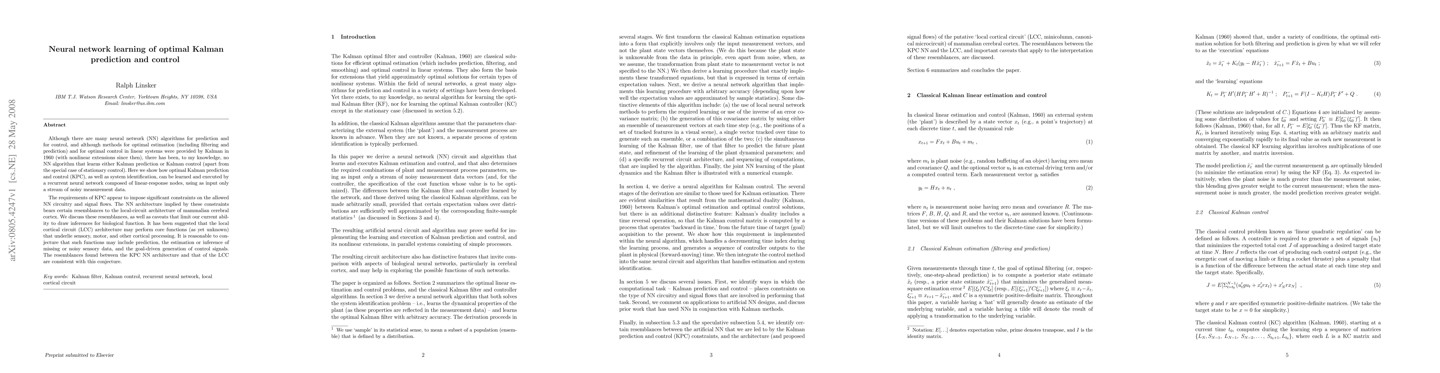 Although there are many neural network (NN) algorithms for prediction and for control, and although methods for optimal estimation (including filtering and prediction) and for optimal control in linear systems were provided by Kalman in 1960 (with nonlinear extensions since then), there has been, to my knowledge, no NN algorithm that learns either Kalman prediction or Kalman control (apart from the special case of stationary control). Here we show how optimal Kalman prediction and control (KPC), as well as system identification, can be learned and executed by a recurrent neural network composed of linear-response nodes, using as input only a stream of noisy measurement data. The requirements of KPC appear to impose significant constraints on the allowed NN circuitry and signal flows. The NN architecture implied by these constraints bears certain resemblances to the local-circuit architecture of mammalian cerebral cortex. We discuss these resemblances, as well as caveats that limit our current ability to draw inferences for biological function. It has been suggested that the local cortical circuit (LCC) architecture may perform core functions (as yet unknown) that underlie sensory, motor,and other cortical processing. It is reasonable to conjecture that such functions may include prediction, the estimation or inference of missing or noisy sensory data, and the goal-driven generation of control signals. The resemblances found between the KPC NN architecture and that of the LCC are consistent with this conjecture.