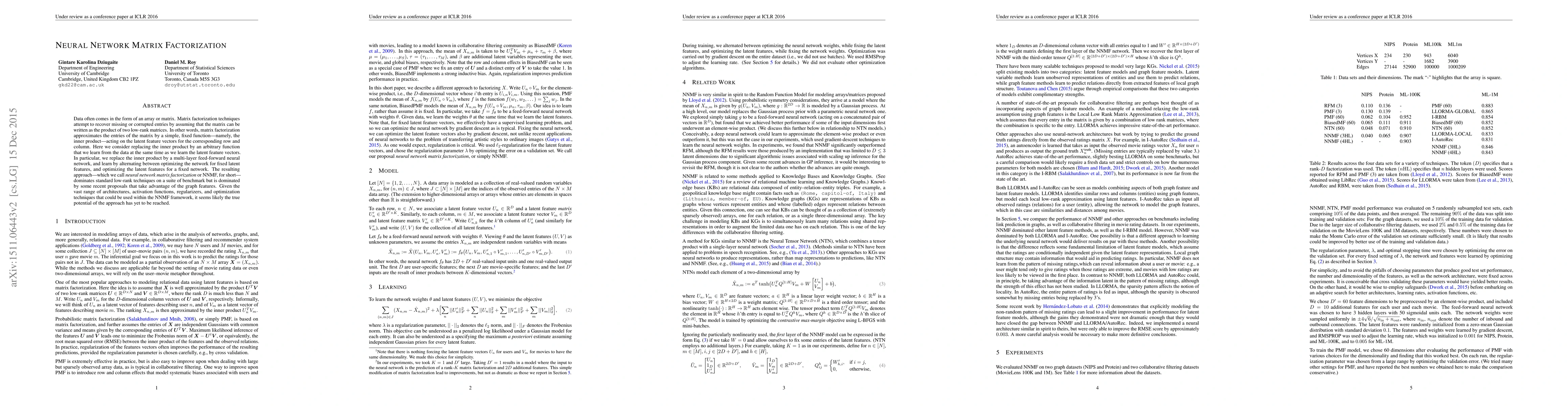 This paper proposes neural network matrix factorization (NNMF), which replaces the inner product in matrix factorization with a multi-layer neural network to learn latent feature vectors. NNMF outperforms standard low-rank techniques on benchmarks but is sometimes surpassed by methods leveraging graph features, indicating the potential for further optimization within the NNMF framework.
