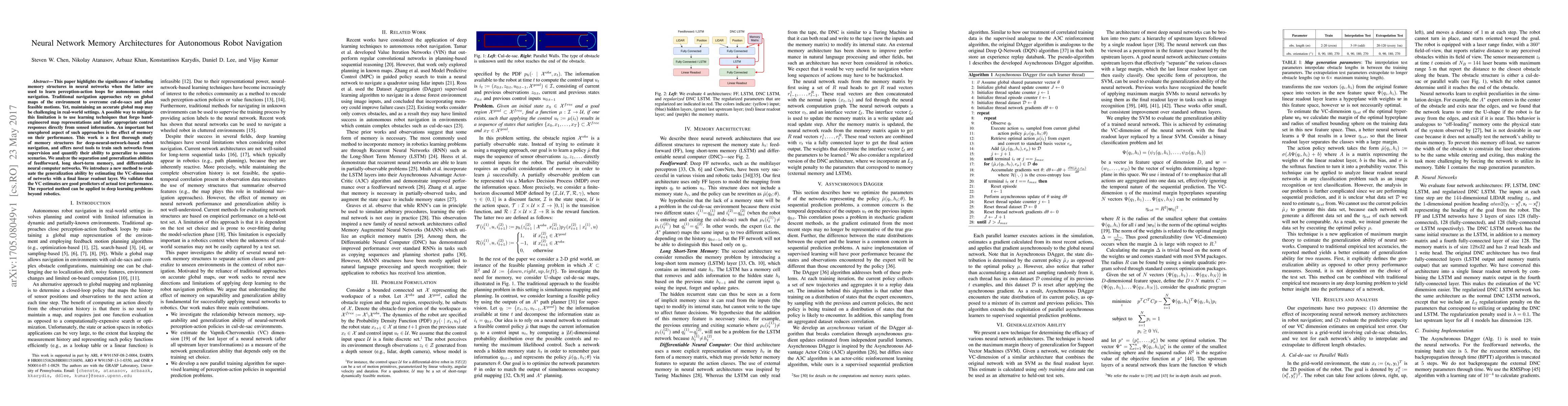 This paper investigates memory architectures in neural networks for autonomous robot navigation, comparing feedforward, LSTM, and DNC networks. It introduces a novel method to evaluate generalization ability using VC-dimension estimates, demonstrating their predictive power for test performance.