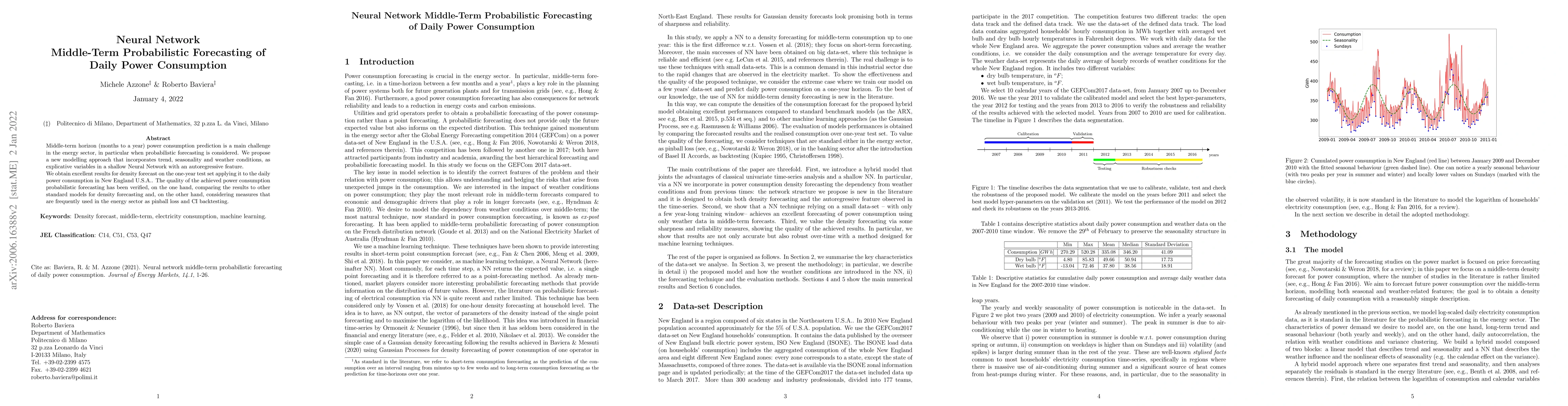 Middle-term horizon (months to a year) power consumption prediction is a main challenge in the energy sector, in particular when probabilistic forecasting is considered. We propose a new modelling approach that incorporates trend, seasonality and weather conditions, as explicative variables in a shallow Neural Network with an autoregressive feature. We obtain excellent results for density forecast on the one-year test set applying it to the daily power consumption in New England U.S.A.. The quality of the achieved power consumption probabilistic forecasting has been verified, on the one hand, comparing the results to other standard models for density forecasting and, on the other hand, considering measures that are frequently used in the energy sector as pinball loss and CI backtesting.