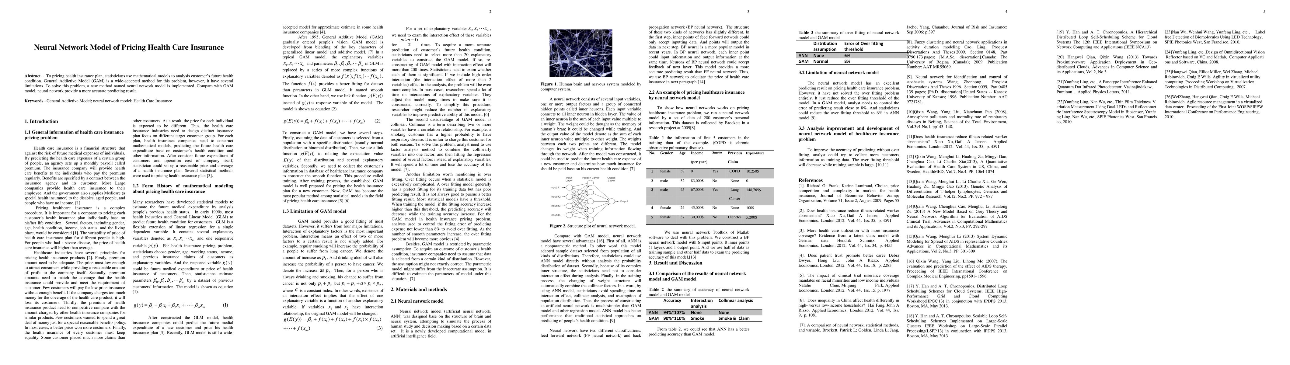 To pricing health insurance plan, statisticians use mathematical models to predict customers' future health condition. General Addictive Model (GAM) is a wide accepted method for this problem. However, it have several limitations. To solve this problem, a new method named neural network model is implemented. Compare with GAM model, neural network provide a more accurate predicting result.