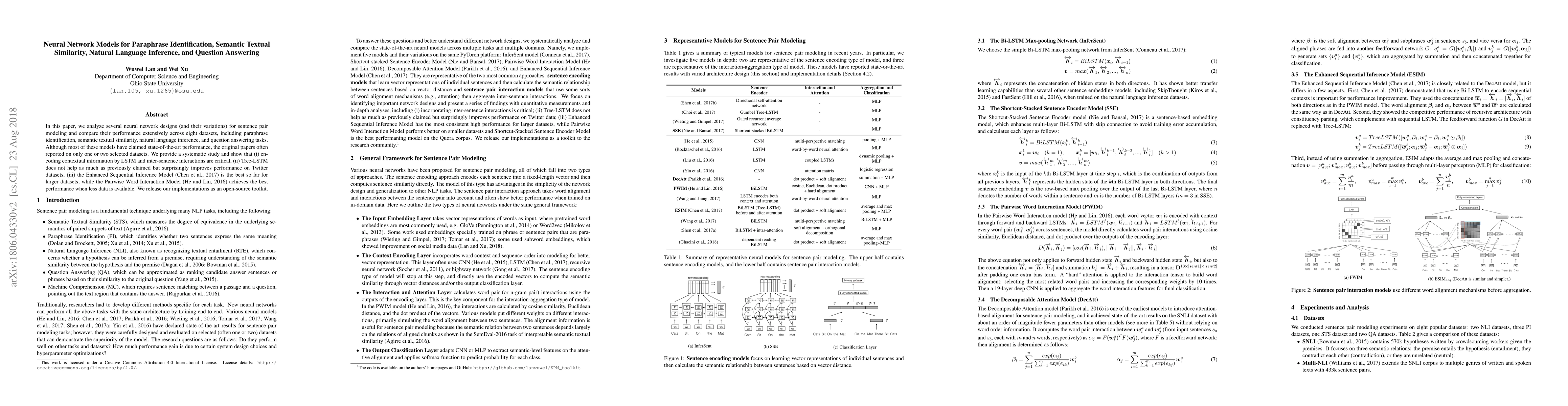 The paper presents an open-source toolkit implementing various neural network models for sentence pair modeling tasks, facilitating further research and comparisons.