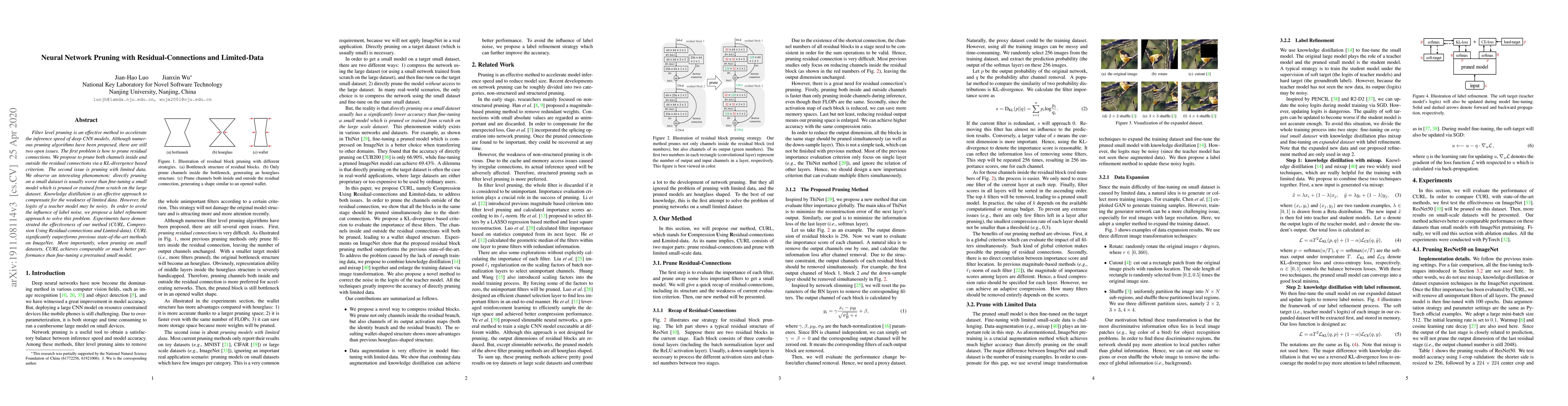 Filter level pruning is an effective method to accelerate the inference speed of deep CNN models. Although numerous pruning algorithms have been proposed, there are still two open issues. The first problem is how to prune residual connections. We propose to prune both channels inside and outside the residual connections via a KL-divergence based criterion. The second issue is pruning with limited data. We observe an interesting phenomenon: directly pruning on a small dataset is usually worse than fine-tuning a small model which is pruned or trained from scratch on the large dataset. Knowledge distillation is an effective approach to compensate for the weakness of limited data. However, the logits of a teacher model may be noisy. In order to avoid the influence of label noise, we propose a label refinement approach to solve this problem. Experiments have demonstrated the effectiveness of our method (CURL, Compression Using Residual-connections and Limited-data). CURL significantly outperforms previous state-of-the-art methods on ImageNet. More importantly, when pruning on small datasets, CURL achieves comparable or much better performance than fine-tuning a pretrained small model.