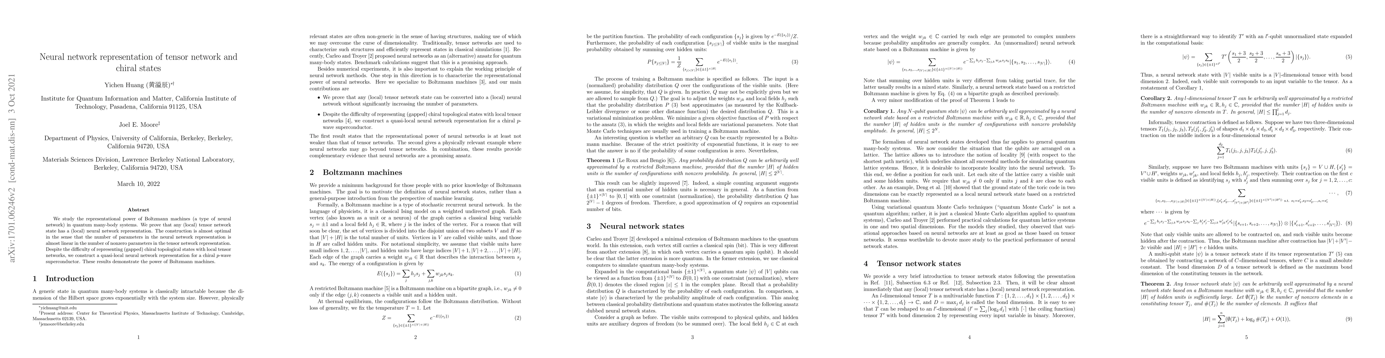 This paper demonstrates that Boltzmann machines, a type of neural network, can effectively represent tensor network states in quantum many-body systems, with near-optimal parameter efficiency. It also constructs a quasi-local neural network representation for chiral topological states, showcasing the potential of Boltzmann machines in complex quantum systems.