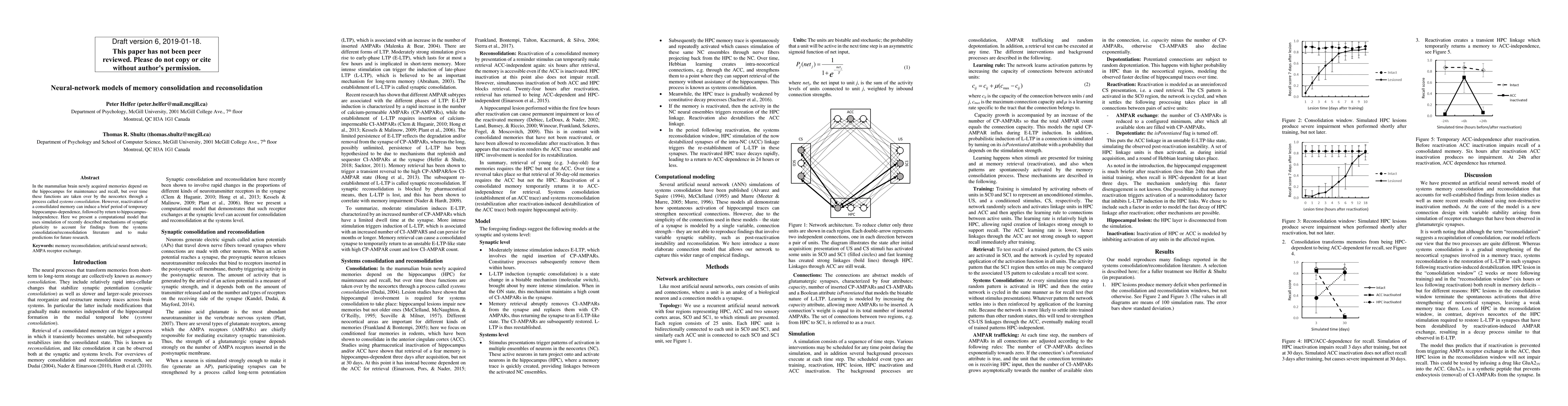 This paper presents a neural network model simulating memory consolidation and reconsolidation, using synaptic plasticity mechanisms to explain the transition of memory functions from hippocampus to neocortex and the temporary reactivation of hippocampus-dependence upon memory recall. The model aims to predict future research findings in this area.
