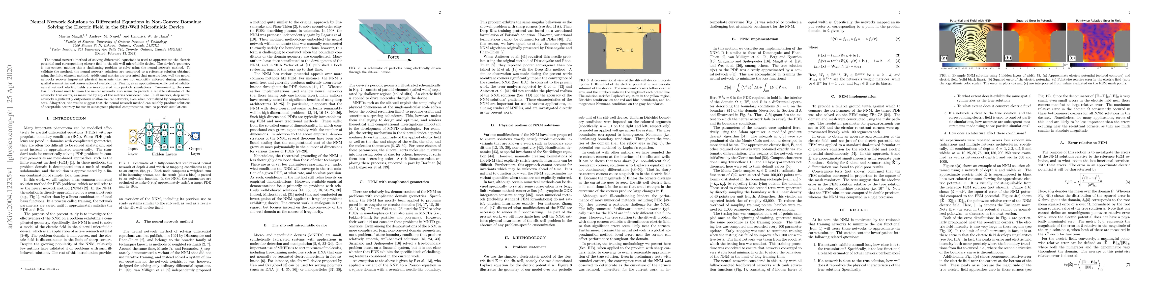 The neural network method of solving differential equations is used to approximate the electric potential and corresponding electric field in the slit-well microfluidic device. The device's geometry is non-convex, making this a challenging problem to solve using the neural network method. To validate the method, the neural network solutions are compared to a reference solution obtained using the finite element method. Additional metrics are presented that measure how well the neural networks recover important physical invariants that are not explicitly enforced during training: spatial symmetries and conservation of electric flux. Finally, as an application-specific test of validity, neural network electric fields are incorporated into particle simulations. Conveniently, the same loss functional used to train the neural networks also seems to provide a reliable estimator of the networks' true errors, as measured by any of the metrics considered here. In all metrics, deep neural networks significantly outperform shallow neural networks, even when normalized by computational cost. Altogether, the results suggest that the neural network method can reliably produce solutions of acceptable accuracy for use in subsequent physical computations, such as particle simulations.