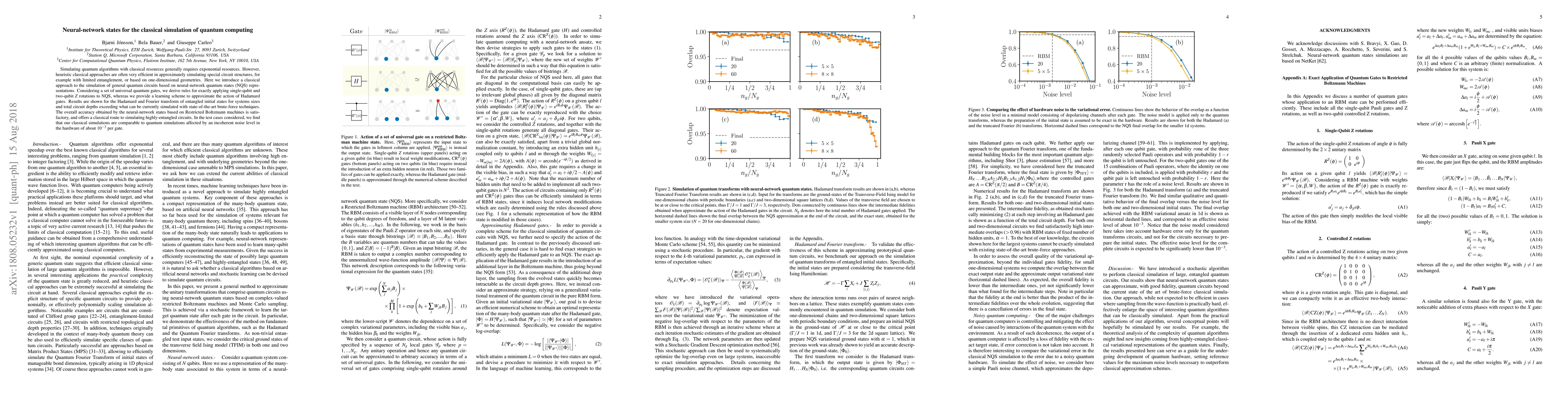 This paper proposes a classical simulation method for quantum computing using neural-network quantum states (NQS) to efficiently simulate general quantum circuits, achieving satisfactory accuracy and surpassing current brute-force techniques in simulating entangled states. The approach combines exact rules for certain quantum gates and a learning scheme for others, showing comparable results to noisy quantum simulations.