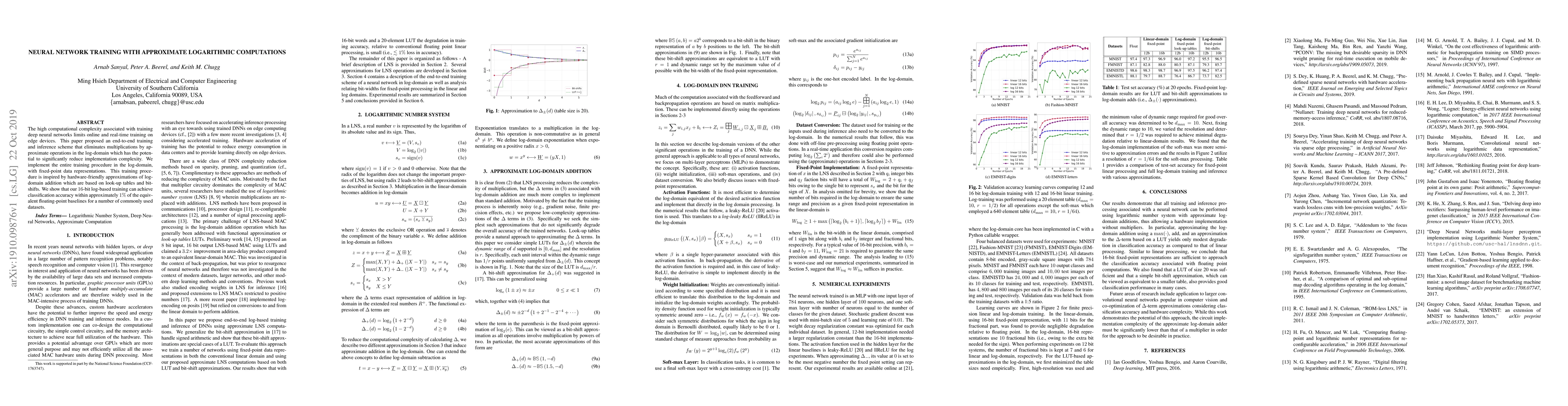 This research demonstrates that logarithmic numbers system can be used for neural network training and inference with minimal degradation in classification accuracy.