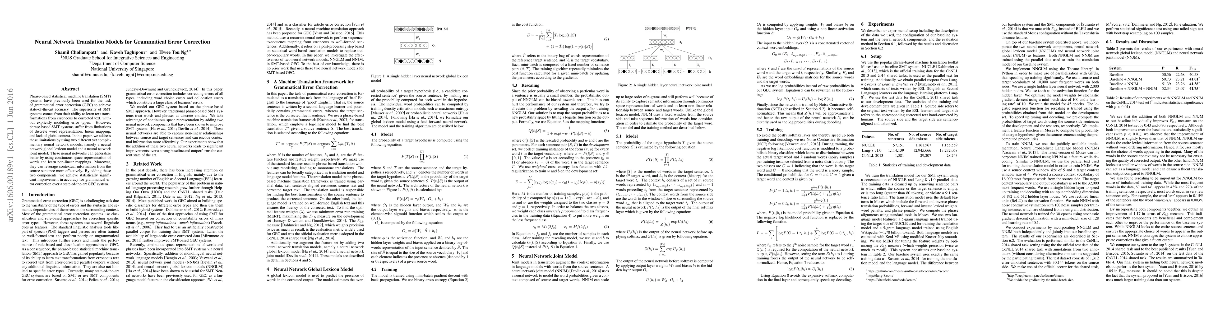 This paper proposes neural network translation models—a global lexicon model and a joint model—to improve grammatical error correction (GEC) over traditional phrase-based statistical machine translation systems. The neural networks utilize continuous word representations and non-linear mappings, leading to better generalization and contextual information usage, resulting in statistically significant accuracy improvements.