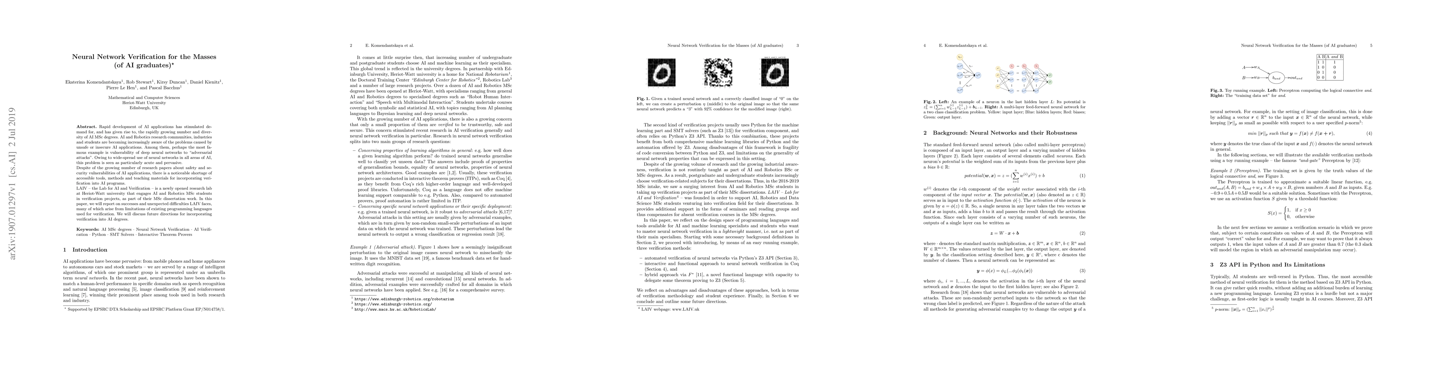 Rapid development of AI applications has stimulated demand for, and has given rise to, the rapidly growing number and diversity of AI MSc degrees. AI and Robotics research communities, industries and students are becoming increasingly aware of the problems caused by unsafe or insecure AI applications. Among them, perhaps the most famous example is vulnerability of deep neural networks to ``adversarial attacks''. Owing to wide-spread use of neural networks in all areas of AI, this problem is seen as particularly acute and pervasive. Despite of the growing number of research papers about safety and security vulnerabilities of AI applications, there is a noticeable shortage of accessible tools, methods and teaching materials for incorporating verification into AI programs. LAIV -- the Lab for AI and Verification -- is a newly opened research lab at Heriot-Watt university that engages AI and Robotics MSc students in verification projects, as part of their MSc dissertation work. In this paper, we will report on successes and unexpected difficulties LAIV faces, many of which arise from limitations of existing programming languages used for verification. We will discuss future directions for incorporating verification into AI degrees.