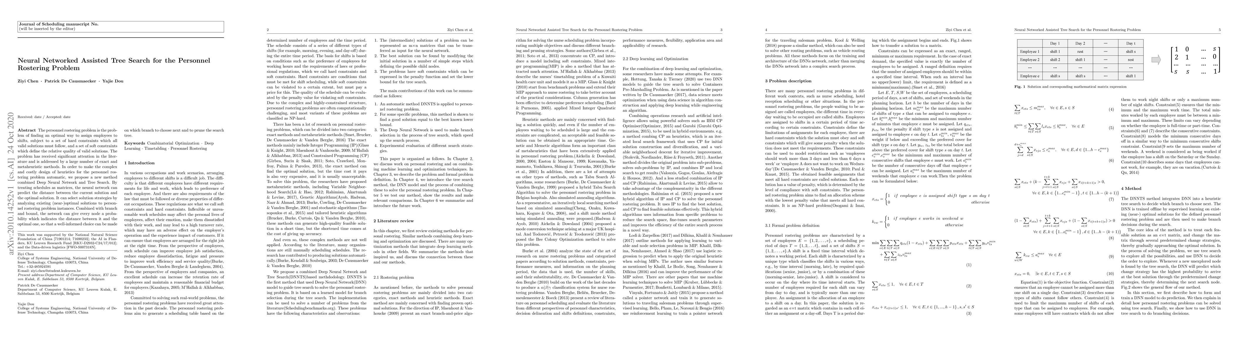 The personnel rostering problem is the problem of finding an optimal way to assign employees to shifts, subject to a set of hard constraints which all valid solutions must follow, and a set of soft constraints which define the relative quality of valid solutions. The problem has received significant attention in the literature and is addressed by a large number of exact and metaheuristic methods. In order to make the complex and costly design of heuristics for the personnel rostering problem automatic, we propose a new method combined Deep Neural Network and Tree Search. By treating schedules as matrices, the neural network can predict the distance between the current solution and the optimal solution. It can select solution strategies by analyzing existing (near-)optimal solutions to personnel rostering problem instances. Combined with branch and bound, the network can give every node a probability which indicates the distance between it and the optimal one, so that a well-informed choice can be made on which branch to choose next and to prune the search tree.
