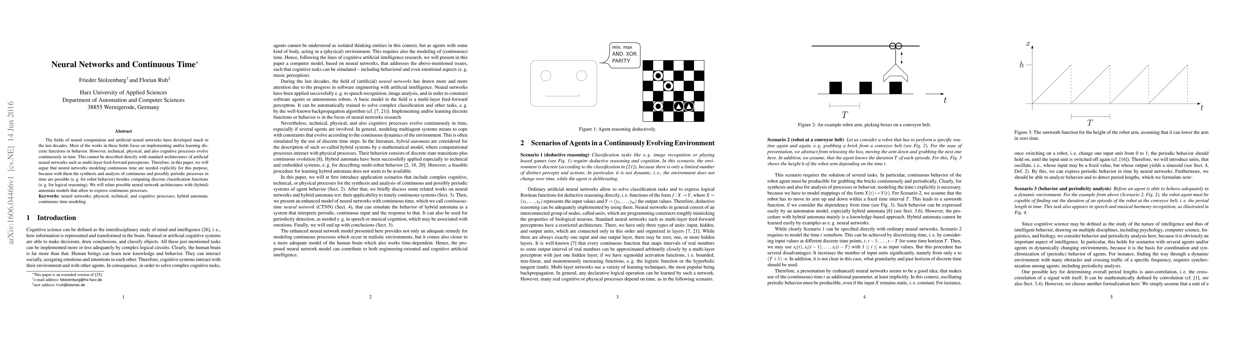 This paper argues for the necessity of neural networks that model continuous time to describe and analyze processes evolving over time, such as robot behaviors, in addition to traditional discrete function computations. It explores neural network architectures that can be related to hybrid automata models for continuous and periodic process synthesis.