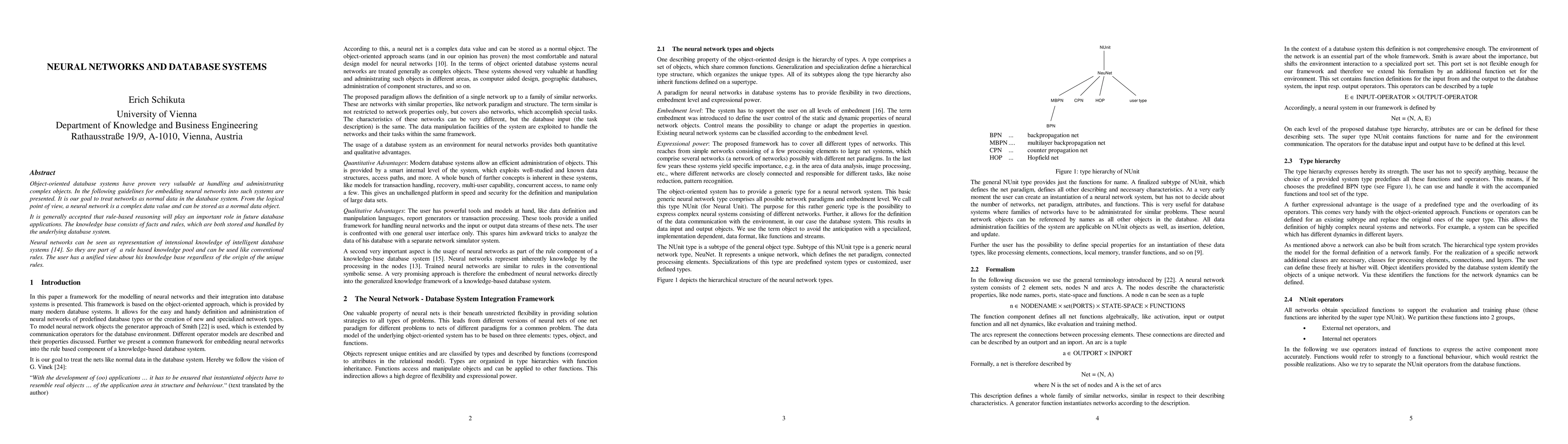 Object-oriented database systems proved very valuable at handling and administrating complex objects. In the following guidelines for embedding neural networks into such systems are presented. It is our goal to treat networks as normal data in the database system. From the logical point of view, a neural network is a complex data value and can be stored as a normal data object. It is generally accepted that rule-based reasoning will play an important role in future database applications. The knowledge base consists of facts and rules, which are both stored and handled by the underlying database system. Neural networks can be seen as representation of intensional knowledge of intelligent database systems. So they are part of a rule based knowledge pool and can be used like conventional rules. The user has a unified view about his knowledge base regardless of the origin of the unique rules.