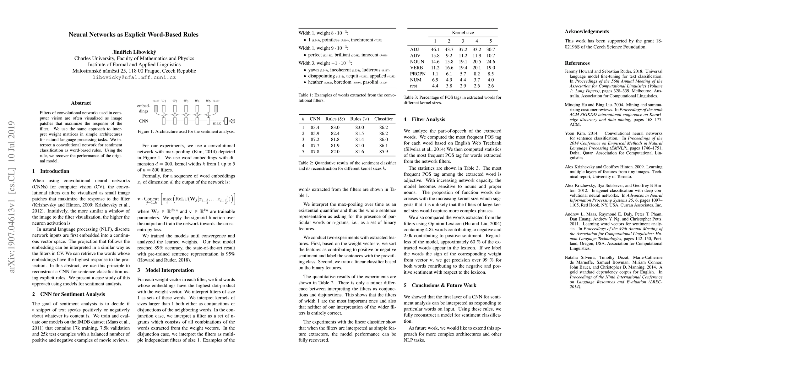 Filters of convolutional networks used in computer vision are often visualized as image patches that maximize the response of the filter. We use the same approach to interpret weight matrices in simple architectures for natural language processing tasks. We interpret a convolutional network for sentiment classification as word-based rules. Using the rule, we recover the performance of the original model.