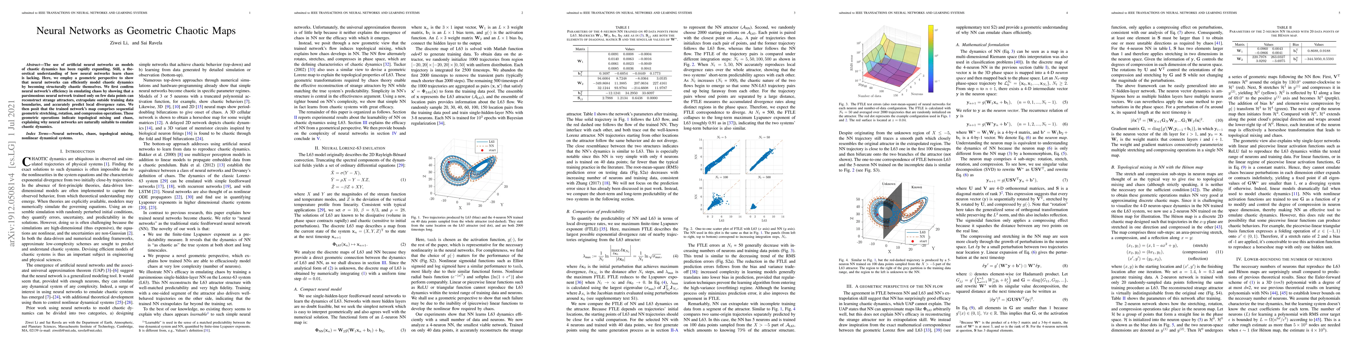 The use of artificial neural networks as models of chaotic dynamics has been rapidly expanding. Still, a theoretical understanding of how neural networks learn chaos is lacking. Here, we employ a geometric perspective to show that neural networks can efficiently model chaotic dynamics by becoming structurally chaotic themselves. We first confirm neural network's efficiency in emulating chaos by showing that a parsimonious neural network trained only on few data points can reconstruct strange attractors, extrapolate outside training data boundaries, and accurately predict local divergence rates. We then posit that the trained network's map comprises sequential geometric stretching, rotation, and compression operations. These geometric operations indicate topological mixing and chaos, explaining why neural networks are naturally suitable to emulate chaotic dynamics.