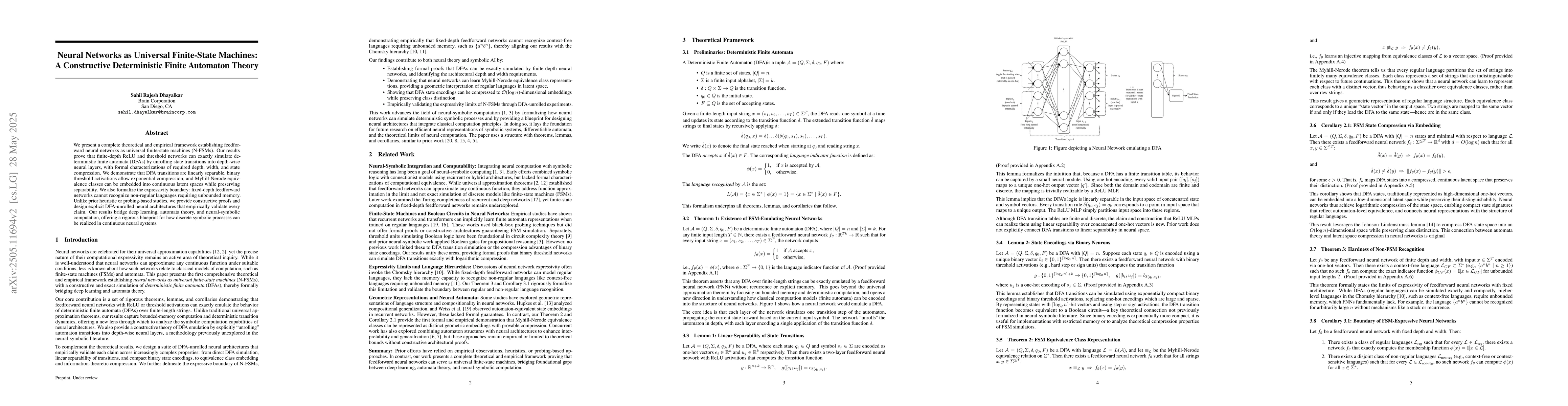 The paper provides constructive proofs and explicit DFA-unrolled neural architectures, demonstrating that finite-depth feedforward networks are universal finite-state machines (N-FSMs).
