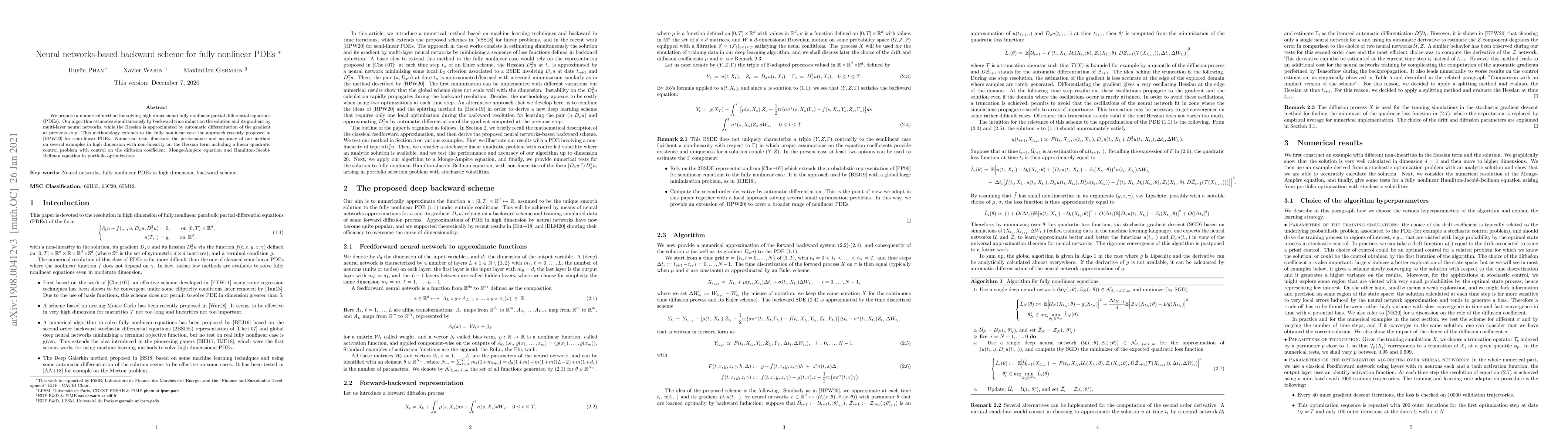 The paper proposes a numerical method for solving high-dimensional fully nonlinear PDEs using a backward scheme with neural networks. It estimates the solution and its gradient simultaneously via backward time induction, approximating the Hessian through automatic differentiation of the gradient.