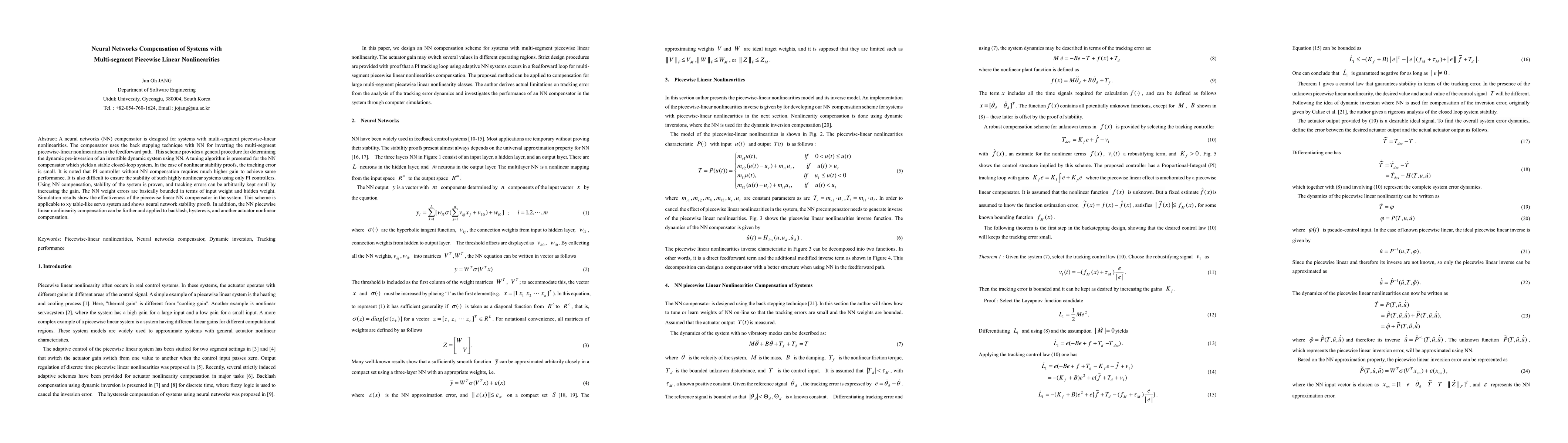 This paper proposes a neural network (NN) compensator for systems with multi-segment piecewise-linear nonlinearities, utilizing back stepping and NN for dynamic pre-inversion. The method ensures system stability and small tracking errors, outperforming traditional PI controllers.