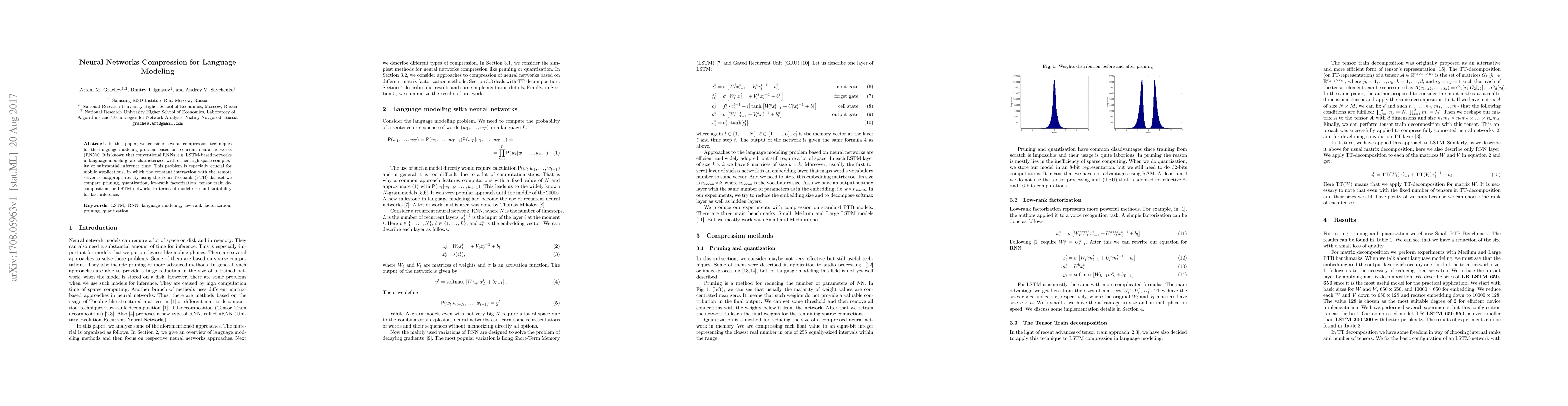In this paper, we consider several compression techniques for the language modeling problem based on recurrent neural networks (RNNs). It is known that conventional RNNs, e.g, LSTM-based networks in language modeling, are characterized with either high space complexity or substantial inference time. This problem is especially crucial for mobile applications, in which the constant interaction with the remote server is inappropriate. By using the Penn Treebank (PTB) dataset we compare pruning, quantization, low-rank factorization, tensor train decomposition for LSTM networks in terms of model size and suitability for fast inference.