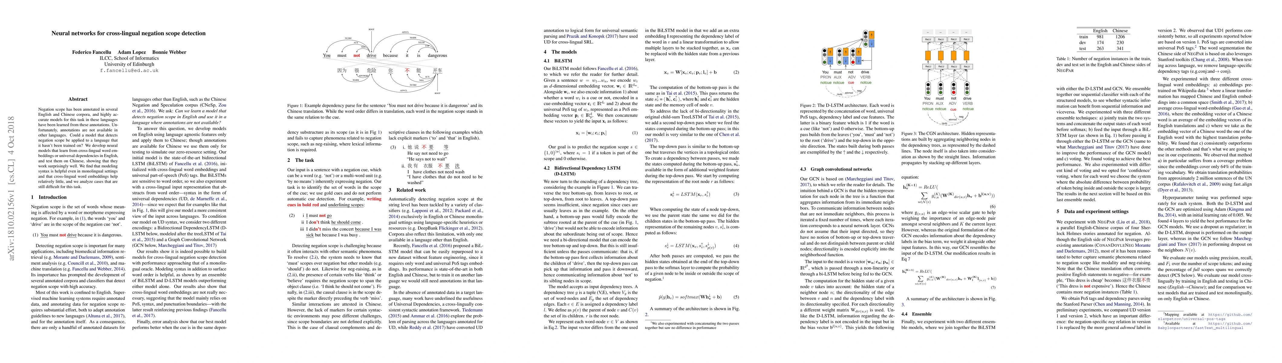 This paper explores neural networks for detecting negation scope across languages using cross-lingual word embeddings and universal dependencies. The study shows that models trained on English can effectively detect negation in Chinese, highlighting the utility of syntax modeling even within monolingual contexts.