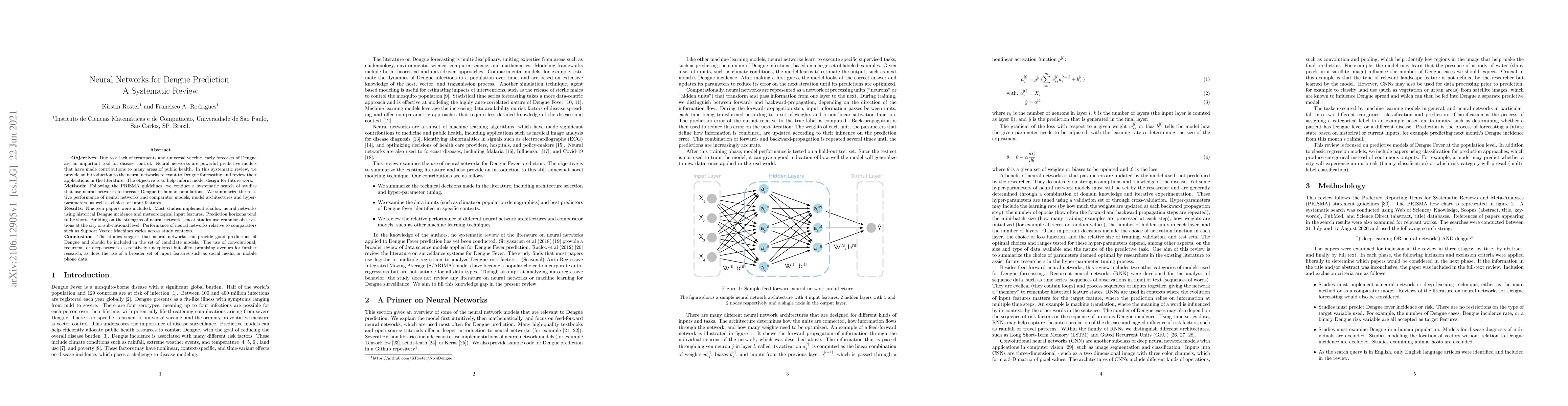 This systematic review examines the application of neural networks in Dengue forecasting, highlighting their performance, model architectures, and input features. Most studies utilize shallow neural networks with historical data and meteorological inputs, showing variable performance compared to comparator models. While promising avenues like convolutional, recurrent, or deep networks remain underexplored, the review suggests neural networks are valuable predictive tools for future Dengue forecasting models.