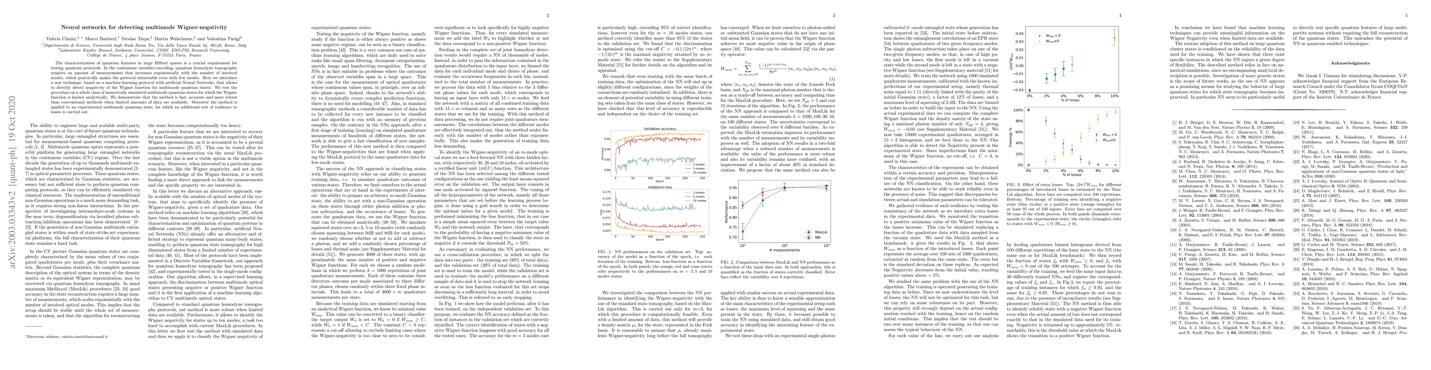 The characterization of quantum features in large Hilbert spaces is a crucial requirement for testing quantum protocols. In the continuous variables encoding, quantum homodyne tomography requires an amount of measurements that increases exponentially with the number of involved modes, which practically makes the protocol intractable even with few modes. Here we introduce a new technique, based on a machine learning protocol with artificial Neural Networks, that allows to directly detect negativity of the Wigner function for multimode quantum states. We test the procedure on a whole class of numerically simulated multimode quantum states for which the Wigner function is known analytically. We demonstrate that the method is fast, accurate and more robust than conventional methods when limited amounts of data are available. Moreover the method is applied to an experimental multimode quantum state, for which an additional test of resilience to losses is carried out.