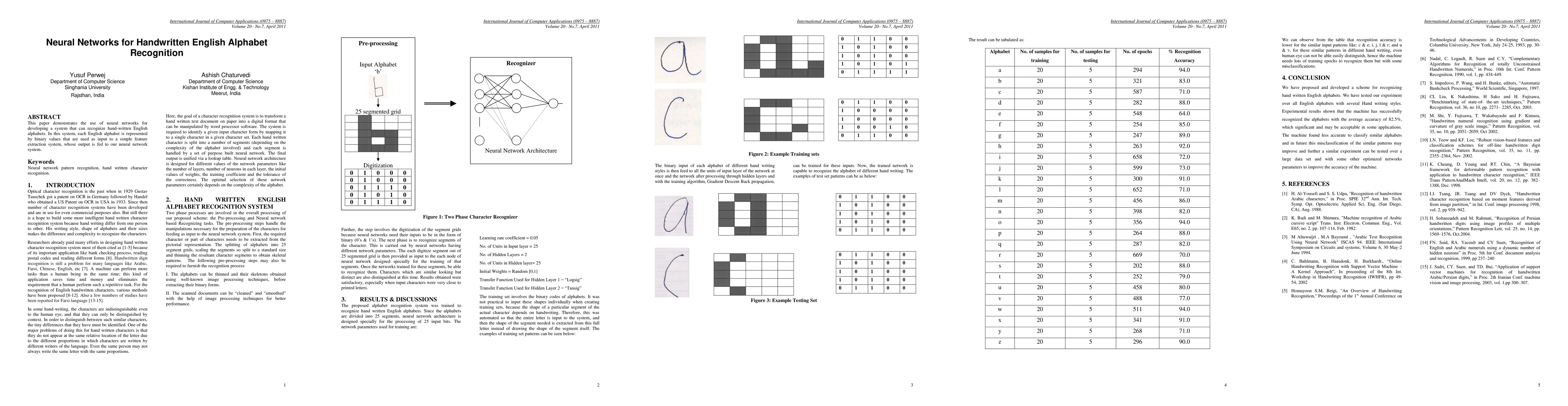 This paper demonstrates the use of neural networks for developing a system that can recognize hand-written English alphabets. In this system, each English alphabet is represented by binary values that are used as input to a simple feature extraction system, whose output is fed to our neural network system.