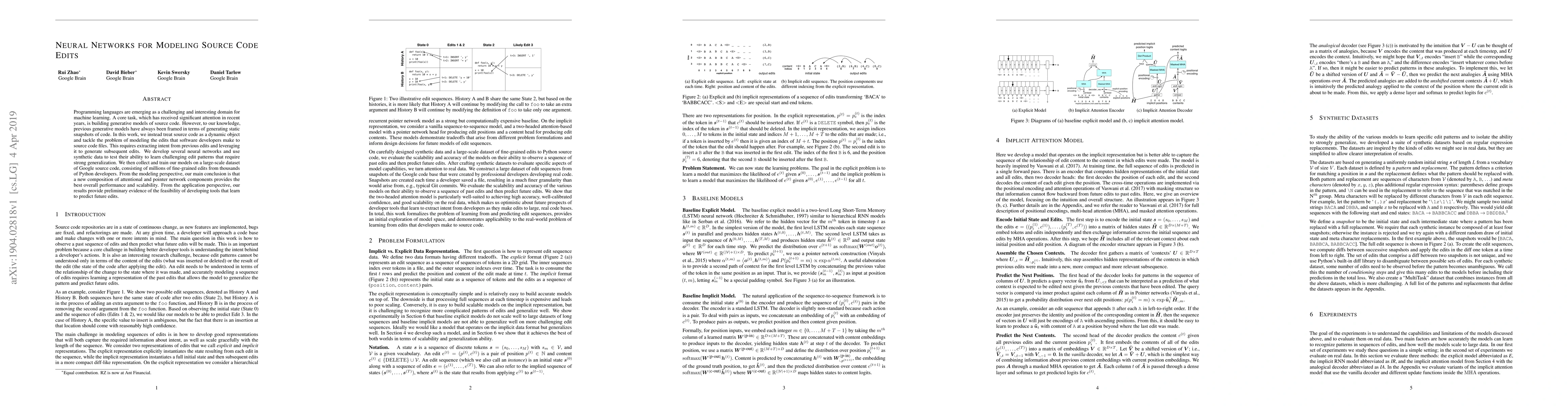 Researchers developed neural networks to predict source code edits, achieving better performance and scalability than previous models. Their approach shows promise for developing tools that can learn to predict future edits.
