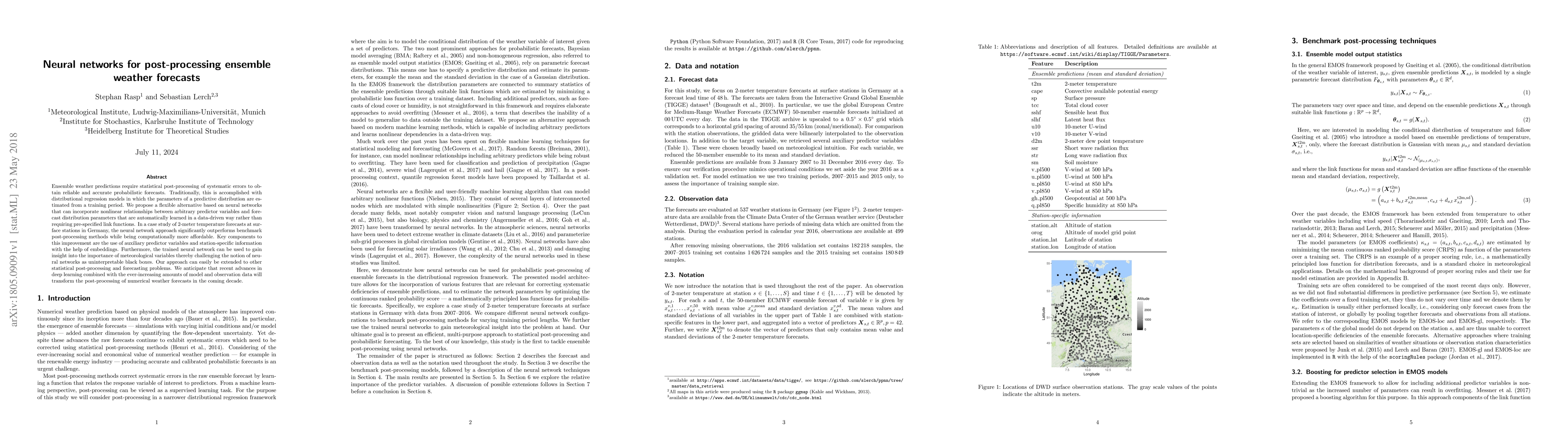 This paper proposes using neural networks for post-processing ensemble weather forecasts, demonstrating significant improvements over traditional methods in a case study of temperature forecasts in Germany. The neural network approach leverages auxiliary predictor variables and station-specific embeddings, offering both better performance and computational efficiency.