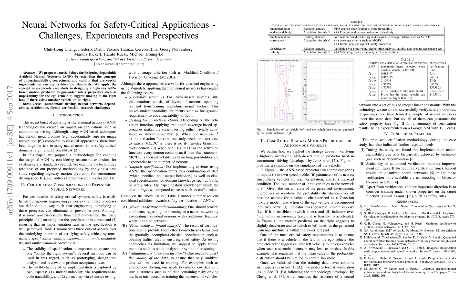 We propose a methodology for designing dependable Artificial Neural Networks (ANN) by extending the concepts of understandability, correctness, and validity that are crucial ingredients in existing certification standards. We apply the concept in a concrete case study in designing a high-way ANN-based motion predictor to guarantee safety properties such as impossibility for the ego vehicle to suggest moving to the right lane if there exists another vehicle on its right.