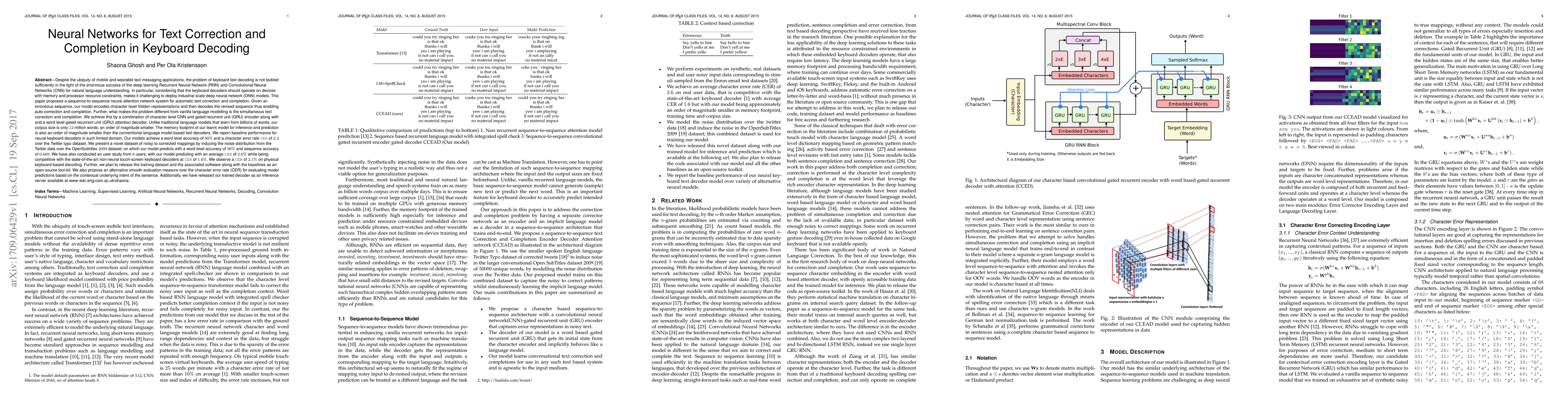 Despite the ubiquity of mobile and wearable text messaging applications, the problem of keyboard text decoding is not tackled sufficiently in the light of the enormous success of the deep learning Recurrent Neural Network (RNN) and Convolutional Neural Networks (CNN) for natural language understanding. In particular, considering that the keyboard decoders should operate on devices with memory and processor resource constraints, makes it challenging to deploy industrial scale deep neural network (DNN) models. This paper proposes a sequence-to-sequence neural attention network system for automatic text correction and completion. Given an erroneous sequence, our model encodes character level hidden representations and then decodes the revised sequence thus enabling auto-correction and completion. We achieve this by a combination of character level CNN and gated recurrent unit (GRU) encoder along with and a word level gated recurrent unit (GRU) attention decoder. Unlike traditional language models that learn from billions of words, our corpus size is only 12 million words; an order of magnitude smaller. The memory footprint of our learnt model for inference and prediction is also an order of magnitude smaller than the conventional language model based text decoders. We report baseline performance for neural keyboard decoders in such limited domain. Our models achieve a word level accuracy of $90\%$ and a character error rate CER of $2.4\%$ over the Twitter typo dataset. We present a novel dataset of noisy to corrected mappings by inducing the noise distribution from the Twitter data over the OpenSubtitles 2009 dataset; on which our model predicts with a word level accuracy of $98\%$ and sequence accuracy of $68.9\%$. In our user study, our model achieved an average CER of $2.6\%$ with the state-of-the-art non-neural touch-screen keyboard decoder at CER of $1.6\%$.