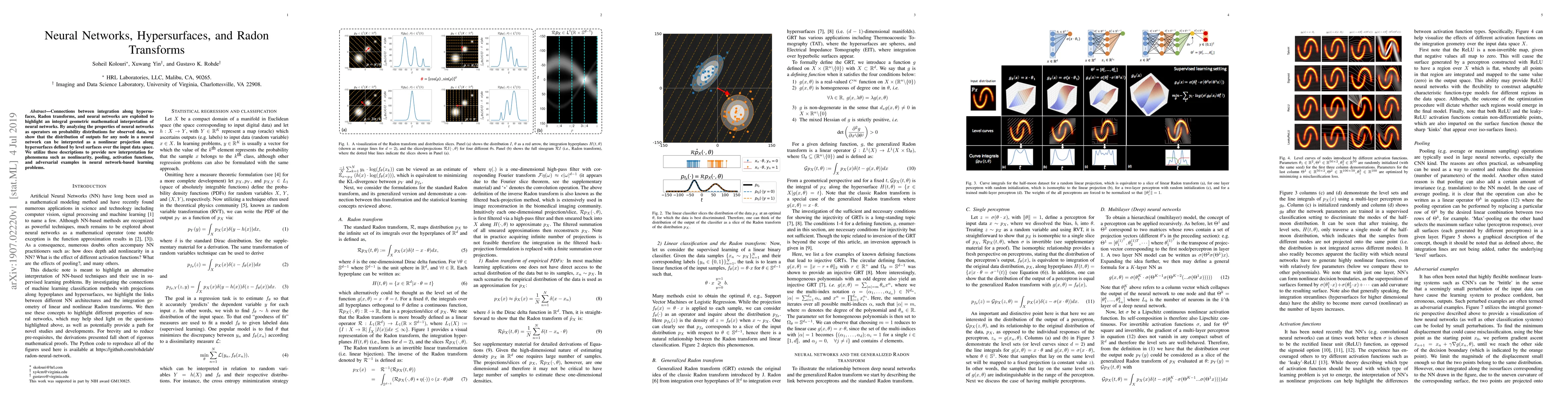Connections between integration along hypersufaces, Radon transforms, and neural networks are exploited to highlight an integral geometric mathematical interpretation of neural networks. By analyzing the properties of neural networks as operators on probability distributions for observed data, we show that the distribution of outputs for any node in a neural network can be interpreted as a nonlinear projection along hypersurfaces defined by level surfaces over the input data space. We utilize these descriptions to provide new interpretation for phenomena such as nonlinearity, pooling, activation functions, and adversarial examples in neural network-based learning problems.