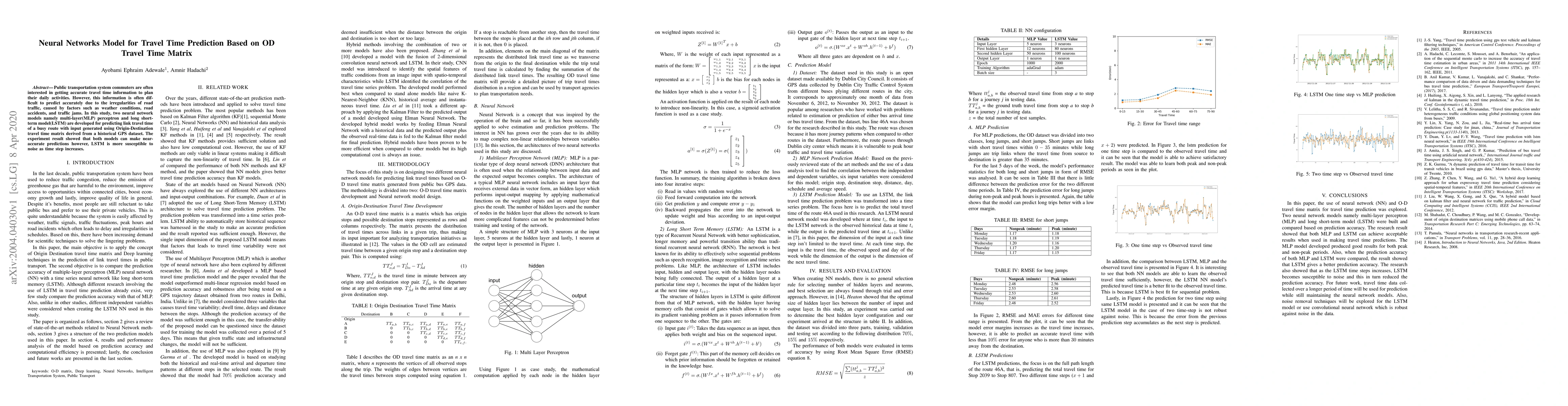 Public transportation system commuters are often interested in getting accurate travel time information to plan their daily activities. However, this information is often difficult to predict accurately due to the irregularities of road traffic, caused by factors such as weather conditions, road accidents, and traffic jams. In this study, two neural network models namely multi-layer(MLP) perceptron and long short-term model(LSTM) are developed for predicting link travel time of a busy route with input generated using Origin-Destination travel time matrix derived from a historical GPS dataset. The experiment result showed that both models can make near-accurate predictions however, LSTM is more susceptible to noise as time step increases.