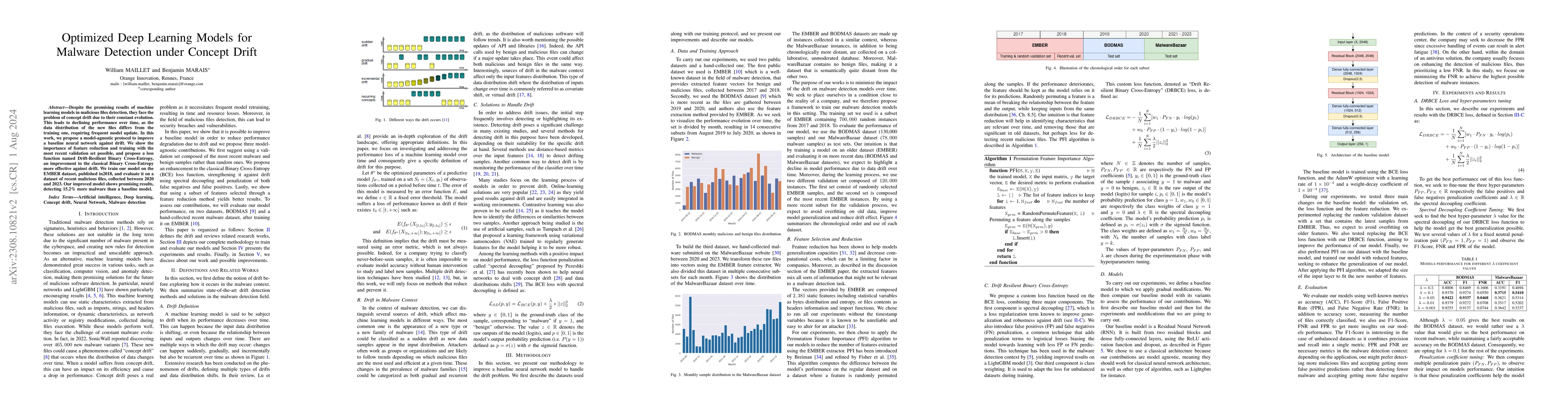 This research proposes a model-agnostic protocol to optimize neural networks for malware detection, addressing concept and data drift through feature reduction and a new loss function, Drift-Resilient Binary Cross-Entropy, which enhances performance against evolving malware. The improved model detects 15.2% more malware compared to a baseline model.