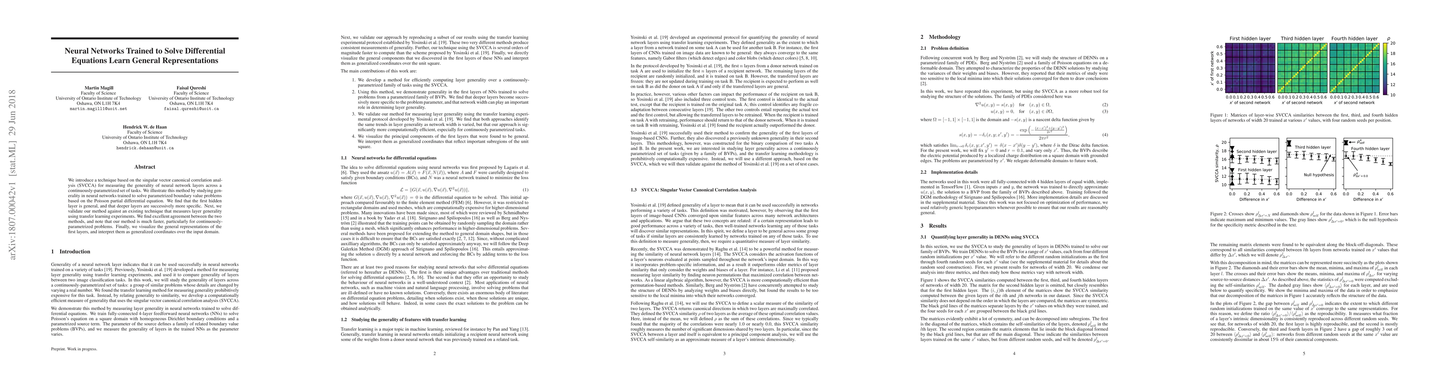 We introduce a technique based on the singular vector canonical correlation analysis (SVCCA) for measuring the generality of neural network layers across a continuously-parametrized set of tasks. We illustrate this method by studying generality in neural networks trained to solve parametrized boundary value problems based on the Poisson partial differential equation. We find that the first hidden layer is general, and that deeper layers are successively more specific. Next, we validate our method against an existing technique that measures layer generality using transfer learning experiments. We find excellent agreement between the two methods, and note that our method is much faster, particularly for continuously-parametrized problems. Finally, we visualize the general representations of the first layers, and interpret them as generalized coordinates over the input domain.