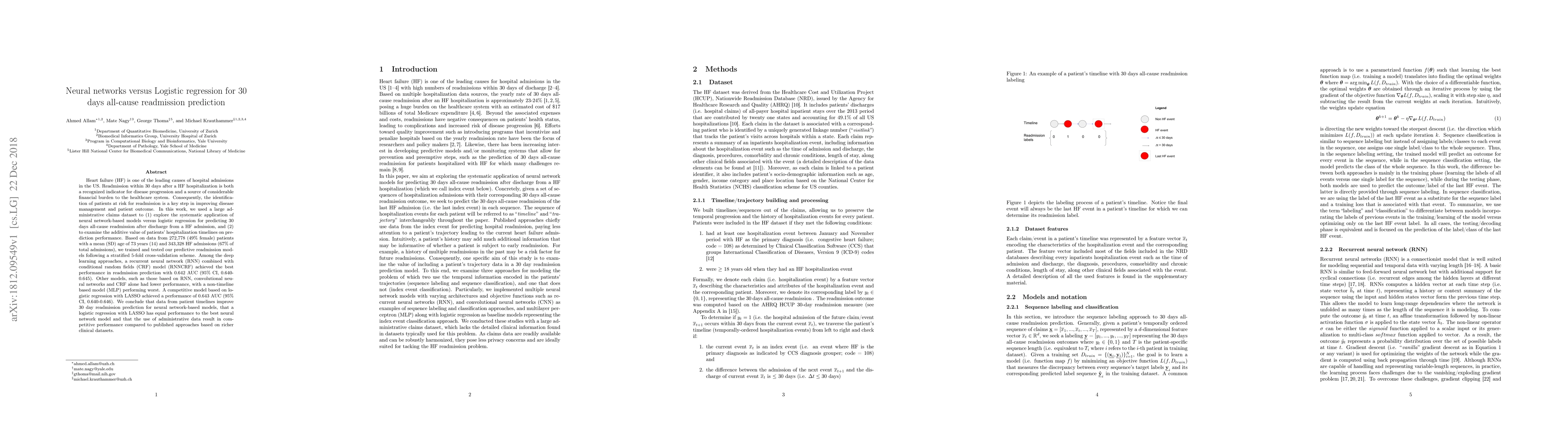 This study compares neural network models and logistic regression for predicting 30-day all-cause readmission in heart failure patients using a large administrative claims dataset. The best-performing neural network model, an RNN combined with CRF, achieved an AUC of 0.642, while logistic regression with LASSO matched this performance at 0.643 AUC.