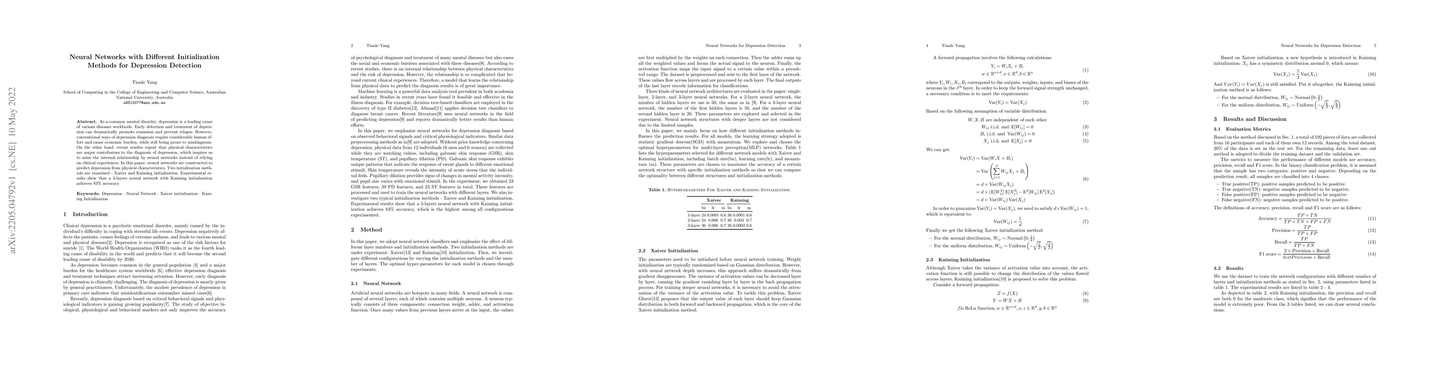 As a common mental disorder, depression is a leading cause of various diseases worldwide. Early detection and treatment of depression can dramatically promote remission and prevent relapse. However, conventional ways of depression diagnosis require considerable human effort and cause economic burden, while still being prone to misdiagnosis. On the other hand, recent studies report that physical characteristics are major contributors to the diagnosis of depression, which inspires us to mine the internal relationship by neural networks instead of relying on clinical experiences. In this paper, neural networks are constructed to predict depression from physical characteristics. Two initialization methods are examined - Xaiver and Kaiming initialization. Experimental results show that a 3-layers neural network with Kaiming initialization achieves $83\%$ accuracy.