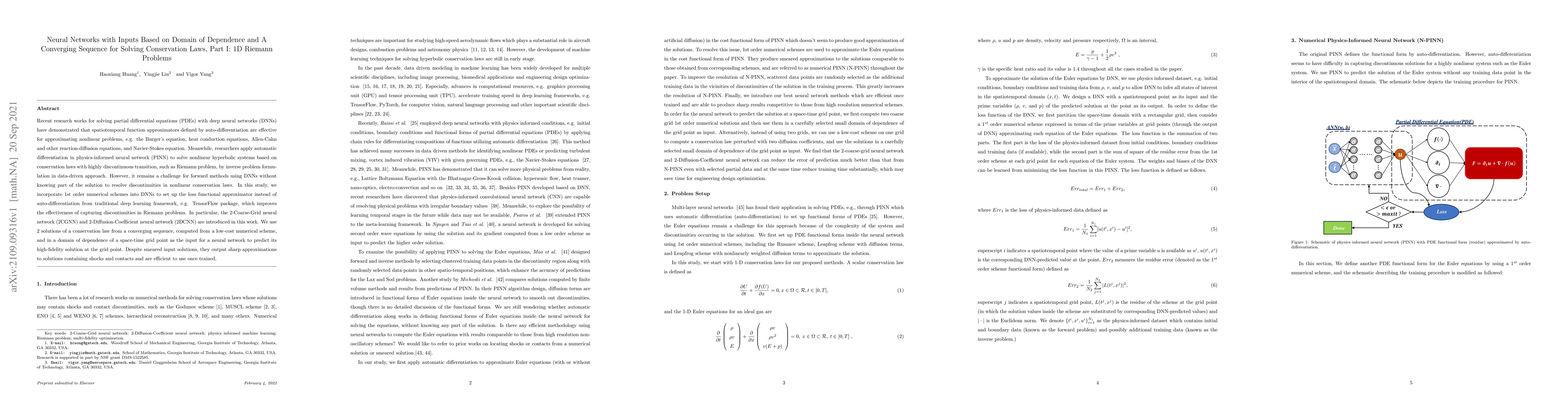Recent research works for solving partial differential equations (PDEs) with deep neural networks (DNNs) have demonstrated that spatiotemporal function approximators defined by auto-differentiation are effective for approximating nonlinear problems, e.g. the Burger's equation, heat conduction equations, Allen-Cahn and other reaction-diffusion equations, and Navier-Stokes equation. Meanwhile, researchers apply automatic differentiation in physics-informed neural network (PINN) to solve nonlinear hyperbolic systems based on conservation laws with highly discontinuous transition, such as Riemann problem, by inverse problem formulation in data-driven approach. However, it remains a challenge for forward methods using DNNs without knowing part of the solution to resolve discontinuities in nonlinear conservation laws. In this study, we incorporate 1st order numerical schemes into DNNs to set up the loss functional approximator instead of auto-differentiation from traditional deep learning framework, e.g. TensorFlow package, which improves the effectiveness of capturing discontinuities in Riemann problems. In particular, the 2-Coarse-Grid neural network (2CGNN) and 2-Diffusion-Coefficient neural network (2DCNN) are introduced in this work. We use 2 solutions of a conservation law from a converging sequence, computed from a low-cost numerical scheme, and in a domain of dependence of a space-time grid point as the input for a neural network to predict its high-fidelity solution at the grid point. Despite smeared input solutions, they output sharp approximations to solutions containing shocks and contacts and are efficient to use once trained.