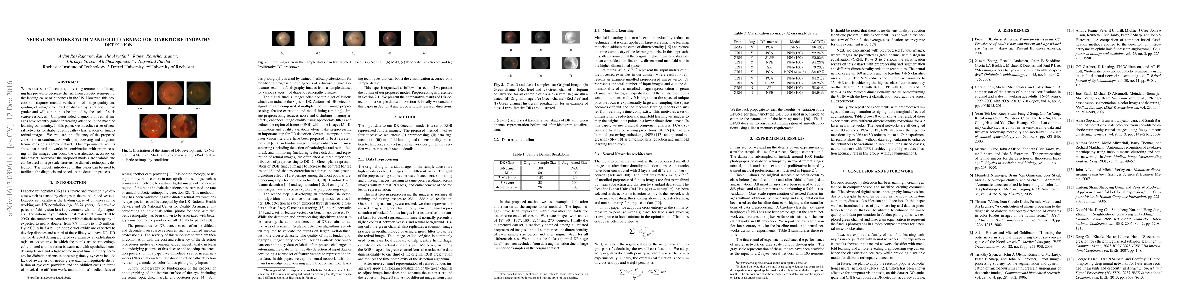 This paper proposes neural networks combined with manifold learning for diabetic retinopathy detection using retinal images. The study demonstrates that preprocessing and augmentation enhance classification accuracy, showing potential for large-scale application to alleviate the shortage of human graders.