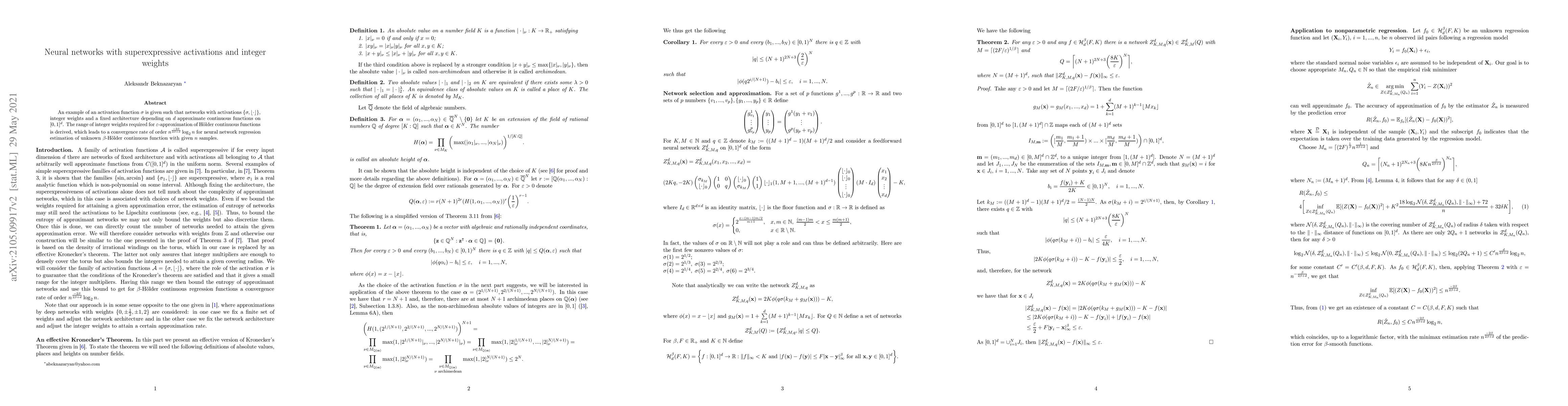 An example of an activation function $\sigma$ is given such that networks with activations $\{\sigma, \lfloor\cdot\rfloor\}$, integer weights and a fixed architecture depending on $d$ approximate continuous functions on $[0,1]^d$. The range of integer weights required for $\varepsilon$-approximation of H\"older continuous functions is derived, which leads to a convergence rate of order $n^{\frac{-2\beta}{2\beta+d}}\log_2n$ for neural network regression estimation of unknown $\beta$-H\"older continuous function with given $n$ samples.