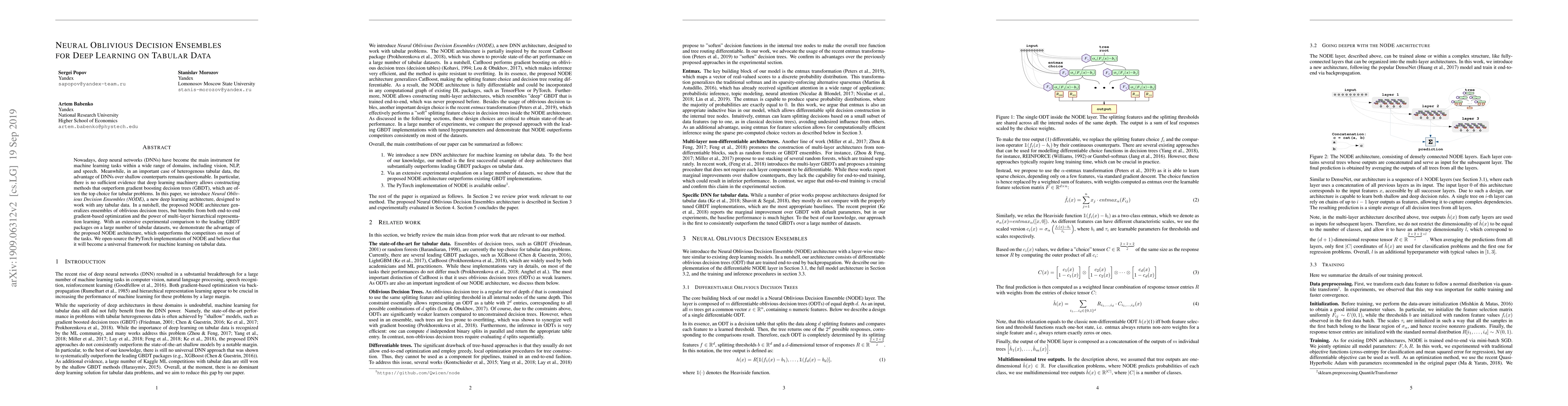 This paper introduces Neural Oblivious Decision Ensembles (NODE), a deep learning architecture designed to outperform gradient boosting decision trees (GBDT) on tabular data. Through extensive experiments, NODE demonstrates superior performance over leading GBDT packages on numerous tabular datasets, suggesting its potential as a universal framework for machine learning on such data.