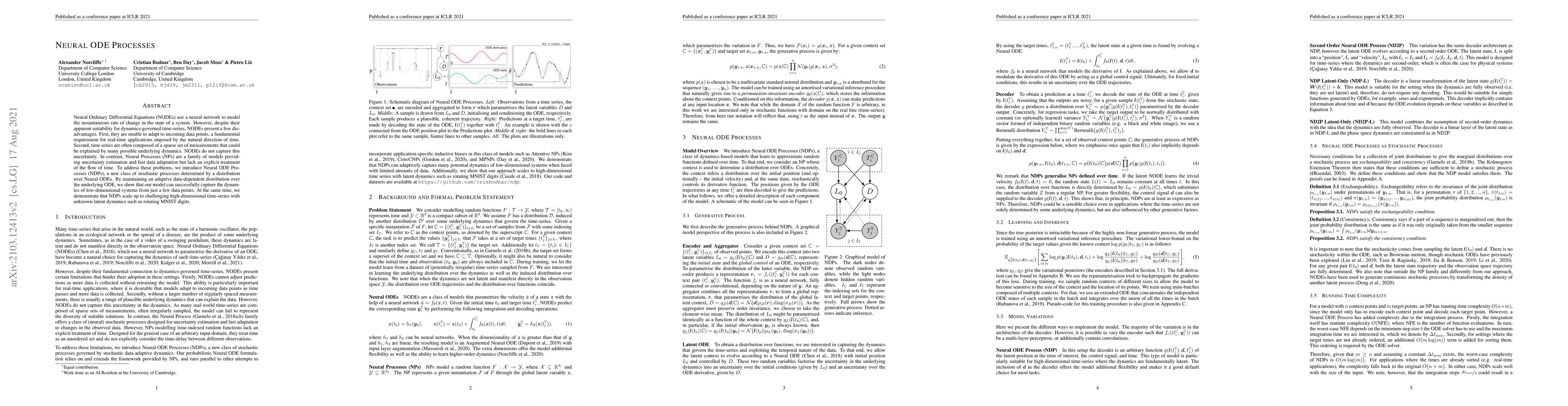 Neural ODE Processes (NDPs) combine the strengths of Neural Ordinary Differential Equations (NODEs) and Neural Processes (NPs) to model time-series data with adaptive uncertainty estimation and real-time data adaptation. NDPs achieve this by maintaining a data-dependent distribution over underlying ODEs, enabling them to handle both low- and high-dimensional time-series effectively.