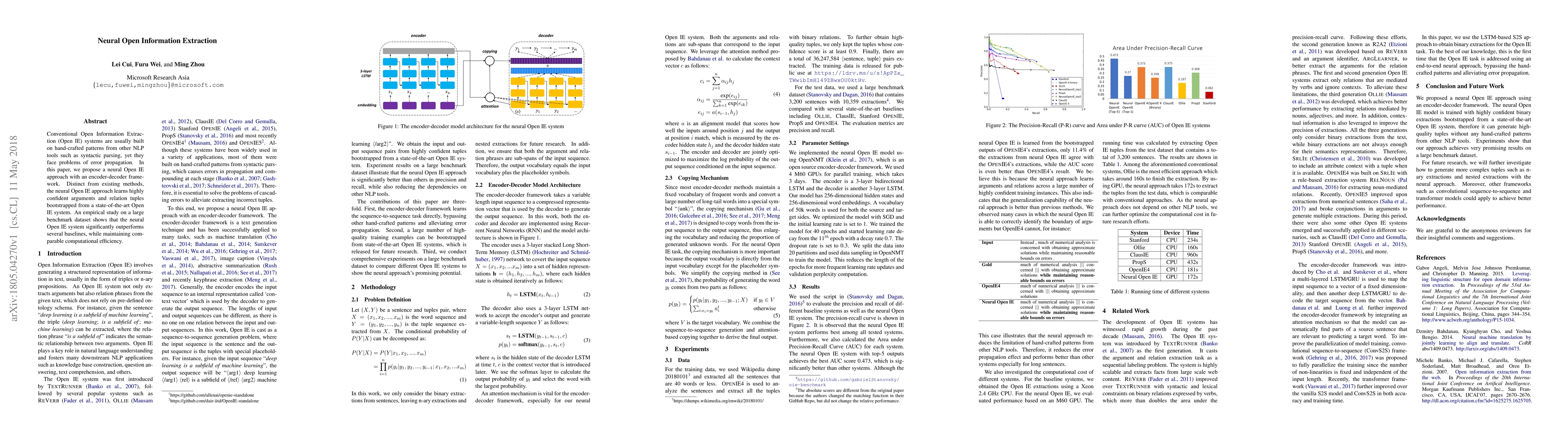 This paper proposes a neural Open Information Extraction (Open IE) approach using an encoder-decoder framework that learns from bootstrapped arguments and relation tuples. It outperforms conventional methods while maintaining computational efficiency, as demonstrated on a large benchmark dataset.