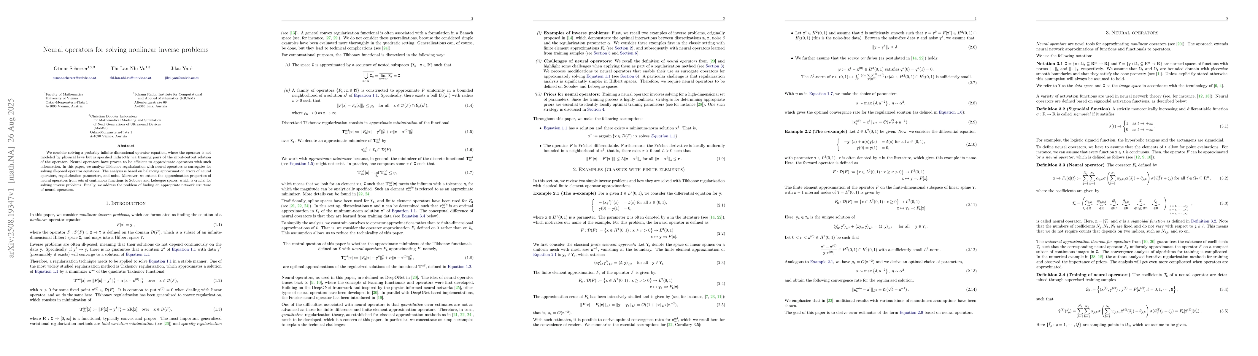 We consider solving a probably infinite dimensional operator equation, where the operator is not modeled by physical laws but is specified indirectly via training pairs of the input-output relation of the operator. Neural operators have proven to be efficient to approximate operators with such information. In this paper, we analyze Tikhonov regularization with neural operators as surrogates for solving ill-posed operator equations. The analysis is based on balancing approximation errors of neural operators, regularization parameters, and noise. Moreover, we extend the approximation properties of neural operators from sets of continuous functions to Sobolev and Lebesgue spaces, which is crucial for solving inverse problems. Finally, we address the problem of finding an appropriate network structure of neural operators.