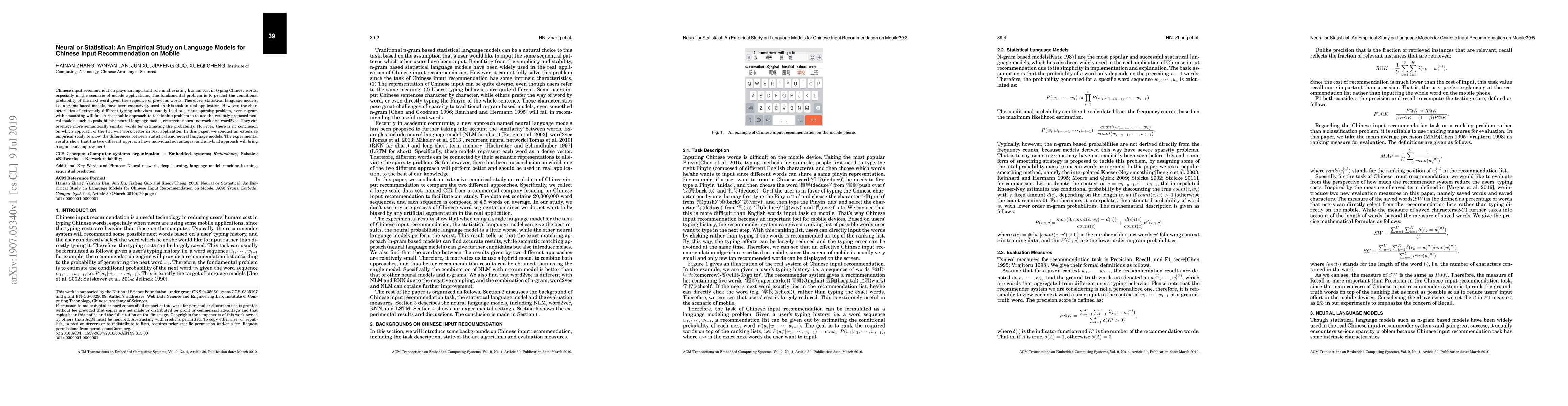 Chinese input recommendation plays an important role in alleviating human cost in typing Chinese words, especially in the scenario of mobile applications. The fundamental problem is to predict the conditional probability of the next word given the sequence of previous words. Therefore, statistical language models, i.e.~n-grams based models, have been extensively used on this task in real application. However, the characteristics of extremely different typing behaviors usually lead to serious sparsity problem, even n-gram with smoothing will fail. A reasonable approach to tackle this problem is to use the recently proposed neural models, such as probabilistic neural language model, recurrent neural network and word2vec. They can leverage more semantically similar words for estimating the probability. However, there is no conclusion on which approach of the two will work better in real application. In this paper, we conduct an extensive empirical study to show the differences between statistical and neural language models. The experimental results show that the two different approach have individual advantages, and a hybrid approach will bring a significant improvement.