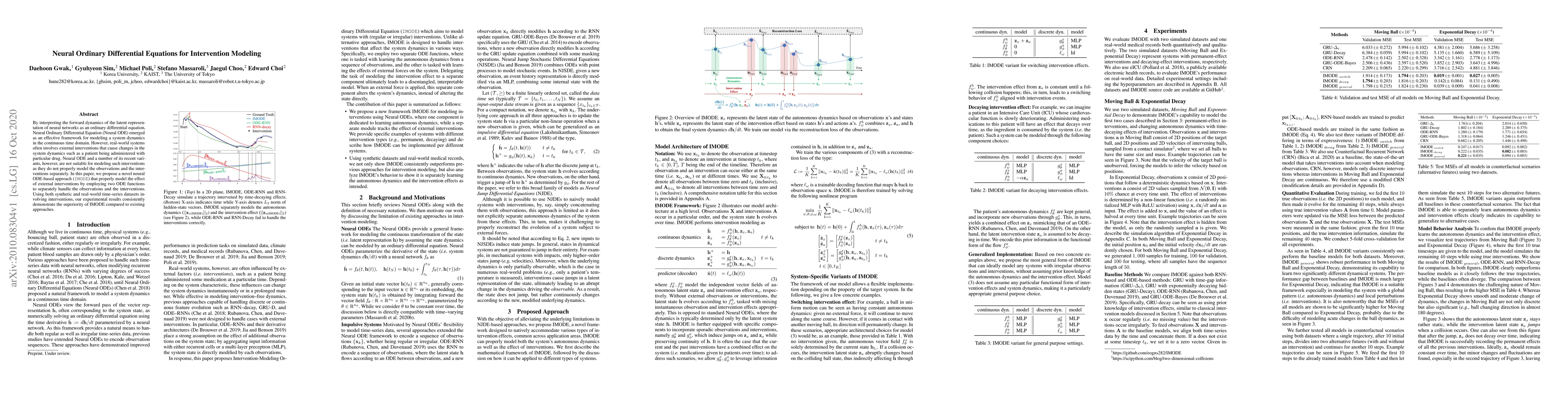 This paper proposes IMODE, a novel Neural Ordinary Differential Equation (Neural ODE) framework that effectively models external interventions by using two separate ODE functions for observations and interventions. Experimental results show IMODE's superior performance over existing methods on both synthetic and real-world datasets.