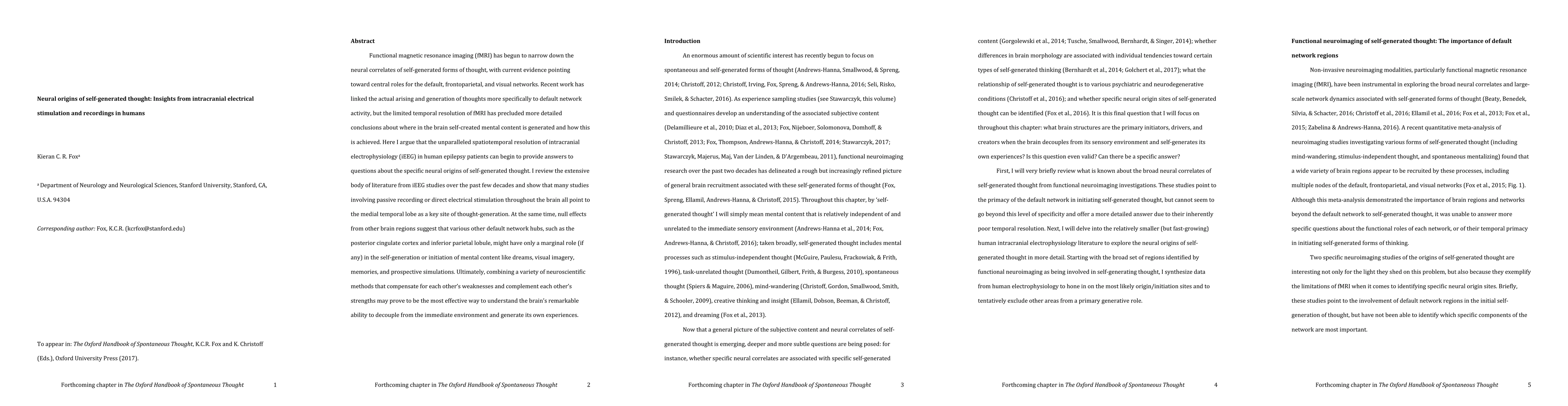 This paper reviews intracranial electrophysiology (iEEG) studies to identify the neural origins of self-generated thought, highlighting the medial temporal lobe as a key site for thought generation, while suggesting that other default network hubs may play a minor role. It advocates for a multi-method approach to fully understand the brain's self-generated experiences.
