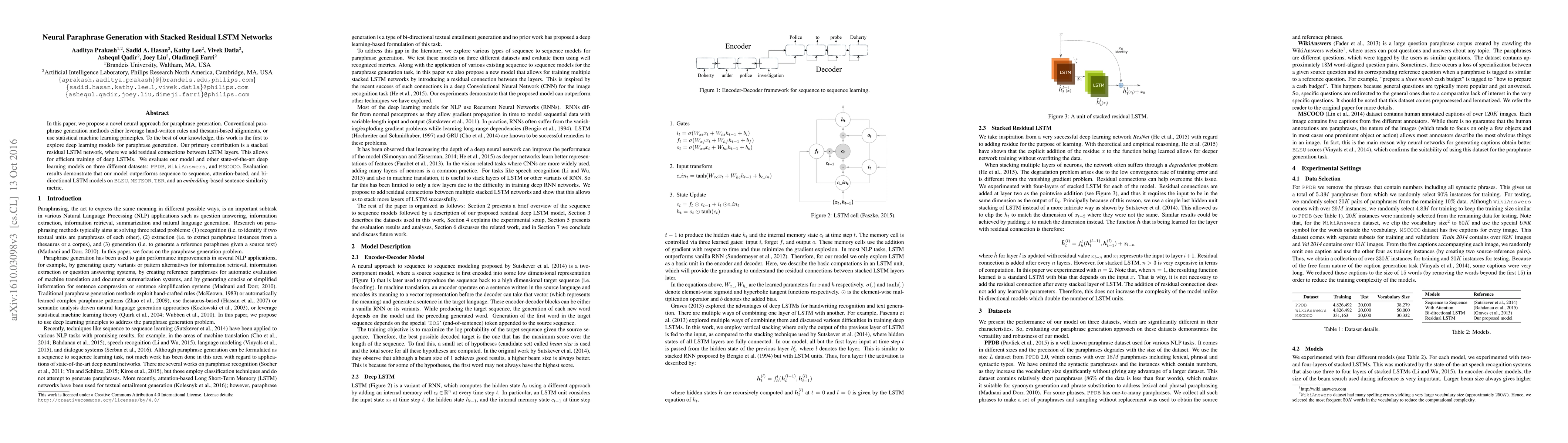 This paper introduces a stacked residual LSTM network for neural paraphrase generation, outperforming other deep learning models on various metrics across three datasets. The use of residual connections facilitates efficient training of deep LSTMs.