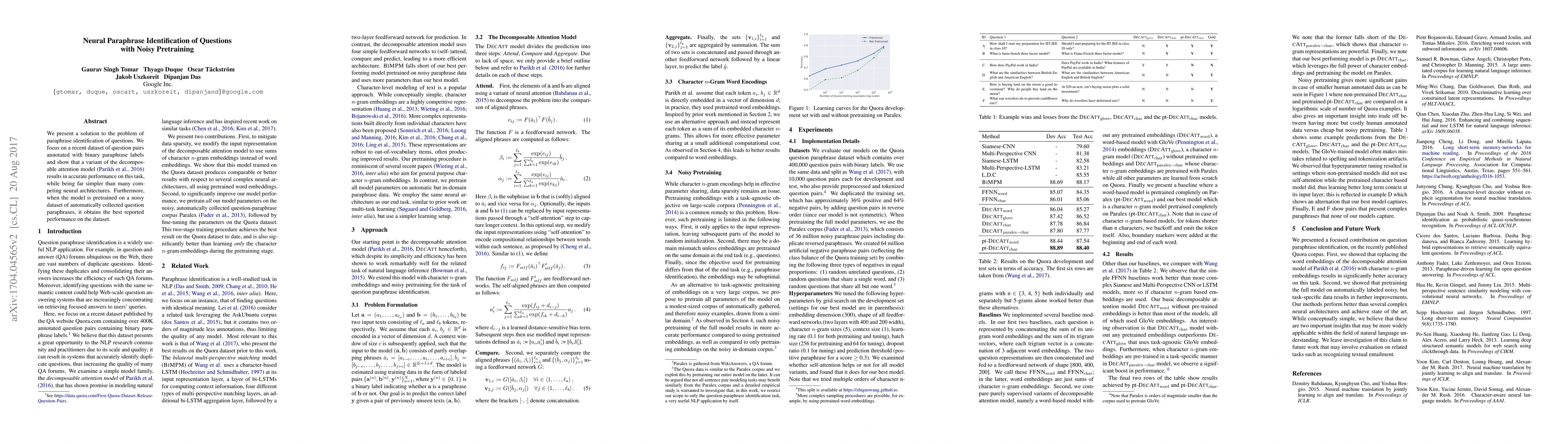 This paper proposes a simplified decomposable attention model for identifying paraphrased question pairs, demonstrating superior performance compared to more complex neural architectures, especially when pretrained on a noisy dataset of automatically collected question paraphrases.