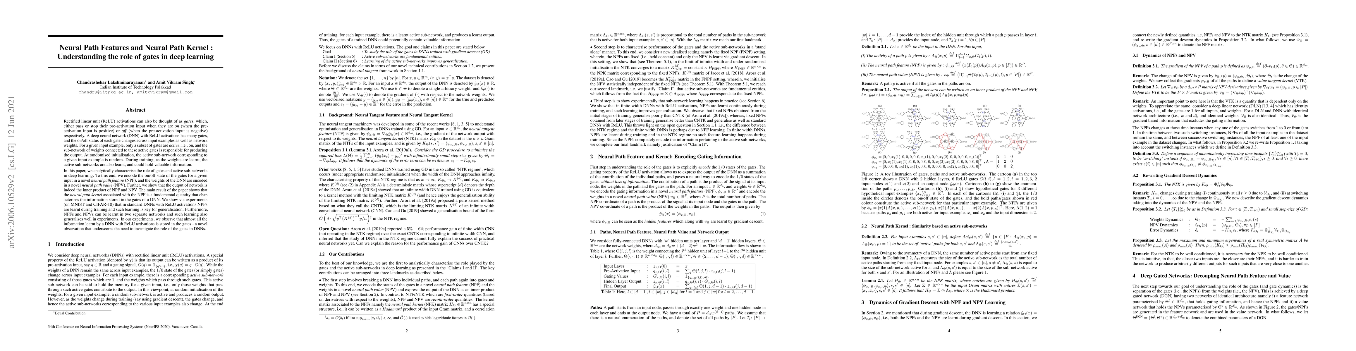 Rectified linear unit (ReLU) activations can also be thought of as 'gates', which, either pass or stop their pre-activation input when they are 'on' (when the pre-activation input is positive) or 'off' (when the pre-activation input is negative) respectively. A deep neural network (DNN) with ReLU activations has many gates, and the on/off status of each gate changes across input examples as well as network weights. For a given input example, only a subset of gates are 'active', i.e., on, and the sub-network of weights connected to these active gates is responsible for producing the output. At randomised initialisation, the active sub-network corresponding to a given input example is random. During training, as the weights are learnt, the active sub-networks are also learnt, and potentially hold very valuable information. In this paper, we analytically characterise the role of active sub-networks in deep learning. To this end, we encode the on/off state of the gates of a given input in a novel 'neural path feature' (NPF), and the weights of the DNN are encoded in a novel 'neural path value' (NPV). Further, we show that the output of network is indeed the inner product of NPF and NPV. The main result of the paper shows that the 'neural path kernel' associated with the NPF is a fundamental quantity that characterises the information stored in the gates of a DNN. We show via experiments (on MNIST and CIFAR-10) that in standard DNNs with ReLU activations NPFs are learnt during training and such learning is key for generalisation. Furthermore, NPFs and NPVs can be learnt in two separate networks and such learning also generalises well in experiments.